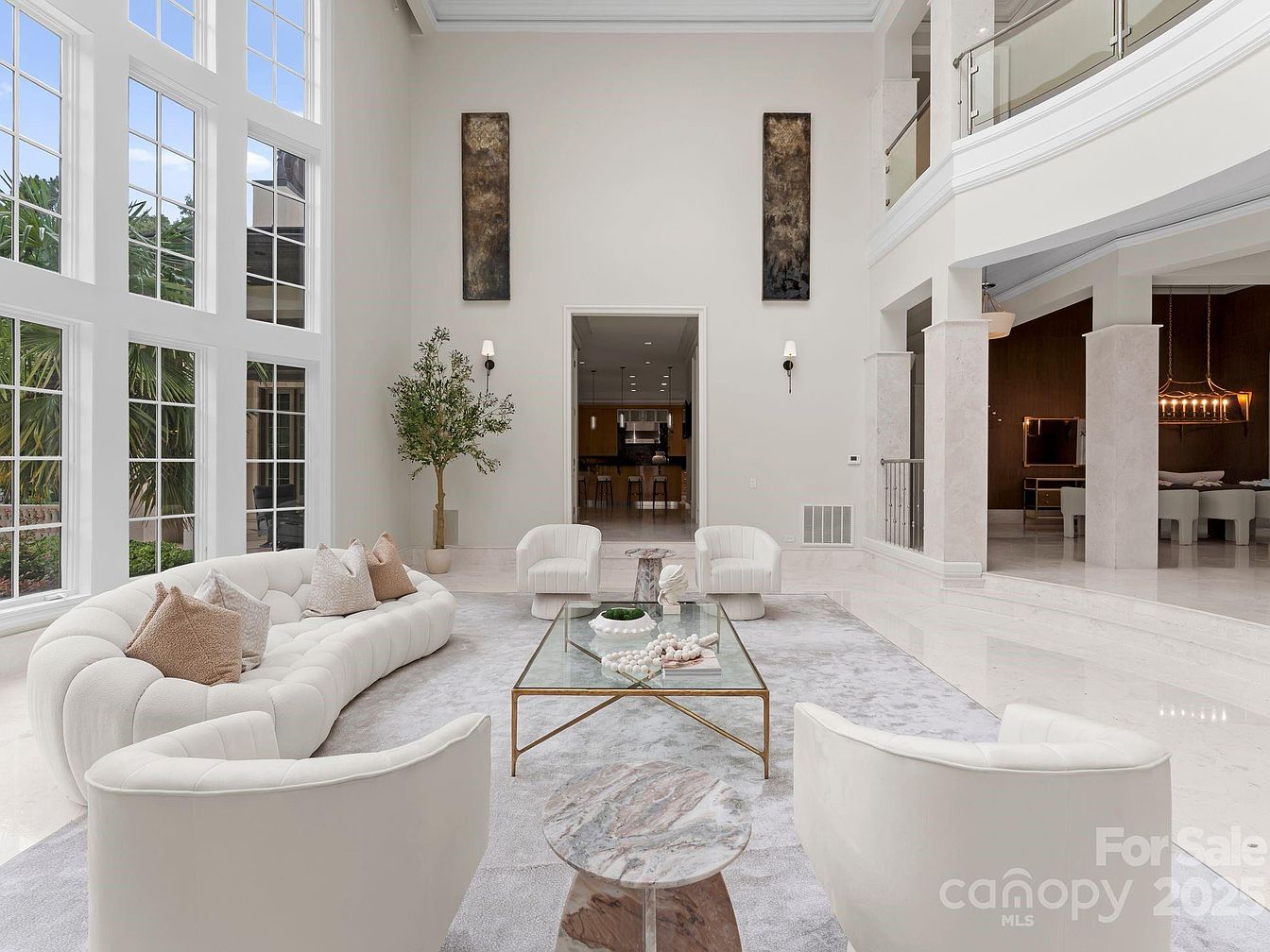 This spacious living room features a stunning open layout with soaring ceilings and large windows that flood the space with natural light. A plush, curved white sectional invites relaxation, accented with soft throw pillows in neutral tones. The elegant marble flooring adds a touch of luxury, seamlessly blending with the pale color palette of the walls. A chic glass coffee table sits at the center, adorned with decorative accents, while a lush indoor plant brings a refreshing touch of greenery. The architectural details, such as decorative sconces and modern art pieces, enhance the sophisticated ambiance, making it perfect for family gatherings.