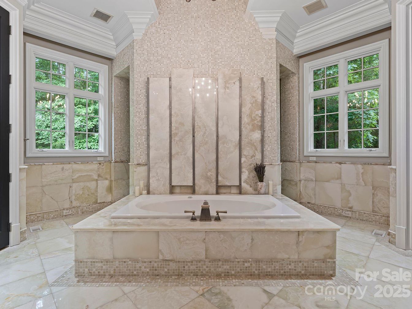 This sophisticated bathroom features elegant marble finishes that create a serene ambiance. A spacious soaking tub sits at the center, framed by stunning stonework and a mosaic backsplash that enhances its luxurious appeal. Large windows allow natural light to flood the space, offering a picturesque view of the lush greenery outside. The thoughtfully designed layout includes inviting seating areas and ample storage, promoting convenience and relaxation. Sophisticated crown molding adds an architectural touch, while neutral color tones effortlessly harmonize with the overall decor, making it a perfect retreat for rejuvenation and self-care.