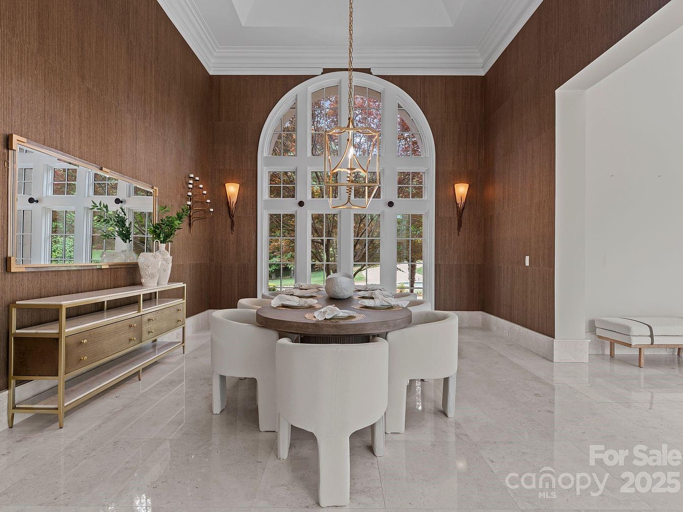 This dining room exudes sophistication with its striking design and warm atmosphere. The circular wooden table, surrounded by plush, upholstered chairs, provides a welcoming space for family gatherings. Elegant lighting hangs above, casting a soft glow over the minimalist dining setup. The rich, textured wall complements the marble flooring, adding depth and luxury. Large, arched windows invite natural light, creating an airy feel and a connection to the outdoors. A chic sideboard offers functional storage, while decorative accents like a plant and modern art enhance the aesthetic, making this room ideal for both intimate dinners and festive celebrations.