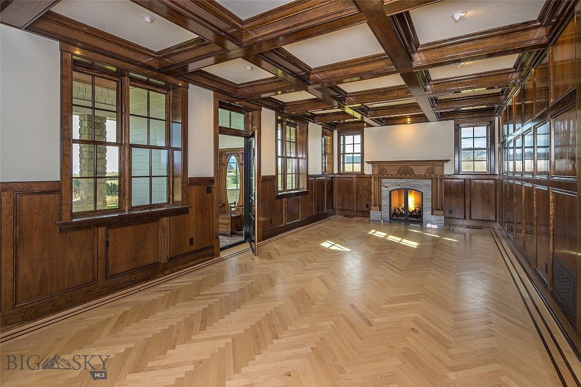 A stately living room featuring rich wood-paneled walls and a dramatic coffered ceiling, complemented by expansive windows that flood the space with natural light. The elegant herringbone hardwood flooring enhances the warmth, while the grand fireplace serves as a cozy focal point perfect for family gatherings. The open yet intimate layout offers versatility for entertaining or relaxing, making it suitable for families with children. Soft neutral wall tones blend harmoniously with the deep brown wood, creating a welcoming and timeless atmosphere. The architectural details evoke classic craftsmanship, lending character and charm to this inviting family-friendly space.