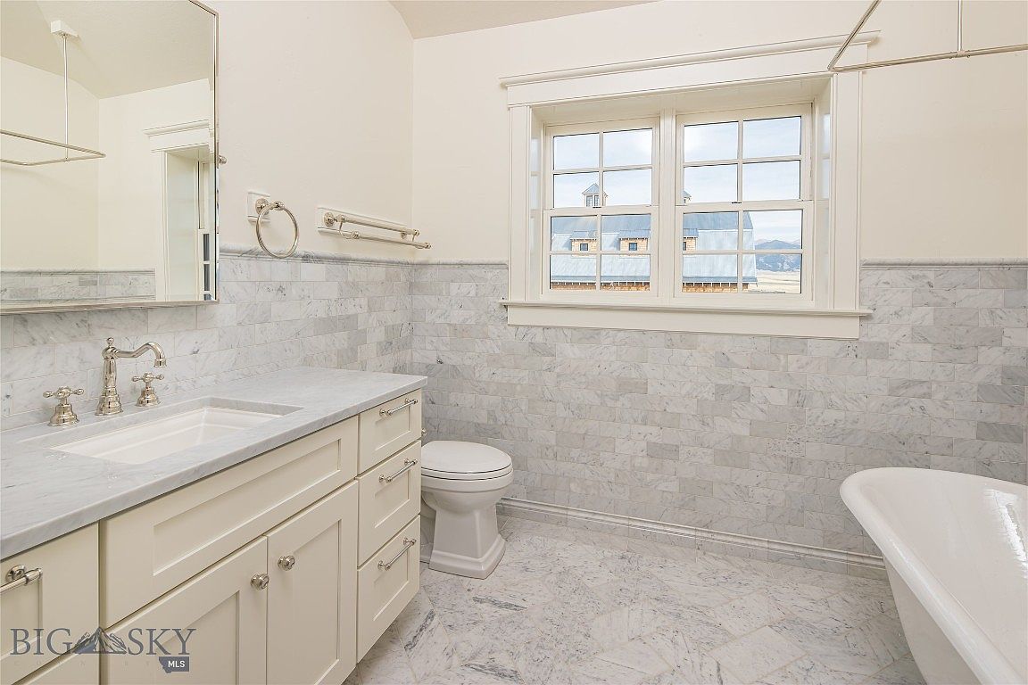 A serene bathroom featuring a classic combination of marble and cream hues, perfect for a fresh and timeless look. The vanity showcases shaker-style cabinetry with elegant chrome hardware, paired with a marble countertop and matching backsplash for cohesive luxury. The soaking tub, partially visible, adds a touch of vintage charm, while soft gray wall tiles reach halfway up for easy cleaning and durability—a family-friendly touch. Natural light pours in through the large window, brightening the space and offering views of the scenic outdoors. Thoughtful details like dual towel bars and polished fixtures ensure both elegance and daily practicality.