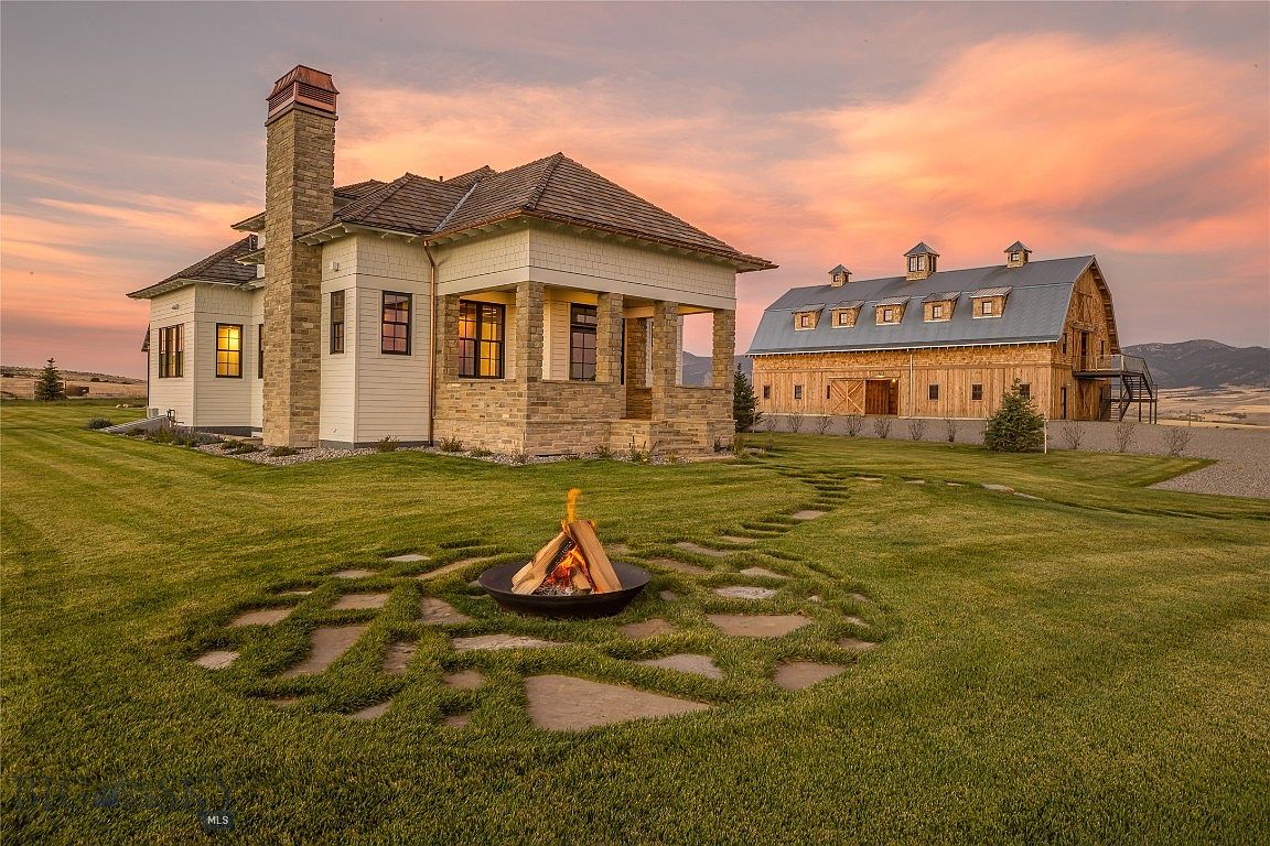 A beautiful sunset illuminates this expansive backyard, featuring a modern fire pit surrounded by an artfully designed stone pathway set within lush green grass. The main house showcases a blend of timeless brick and crisp white siding, accented with tall windows that flood the interior with natural light. Nearby, a spacious barn with classic rural charm offers versatile space for family activities or storage. The open outdoor setting is perfect for gatherings, making it ideal for both children and adults. Warm tones, rustic textures, and well-maintained landscaping create a serene and inviting atmosphere for relaxation and play.