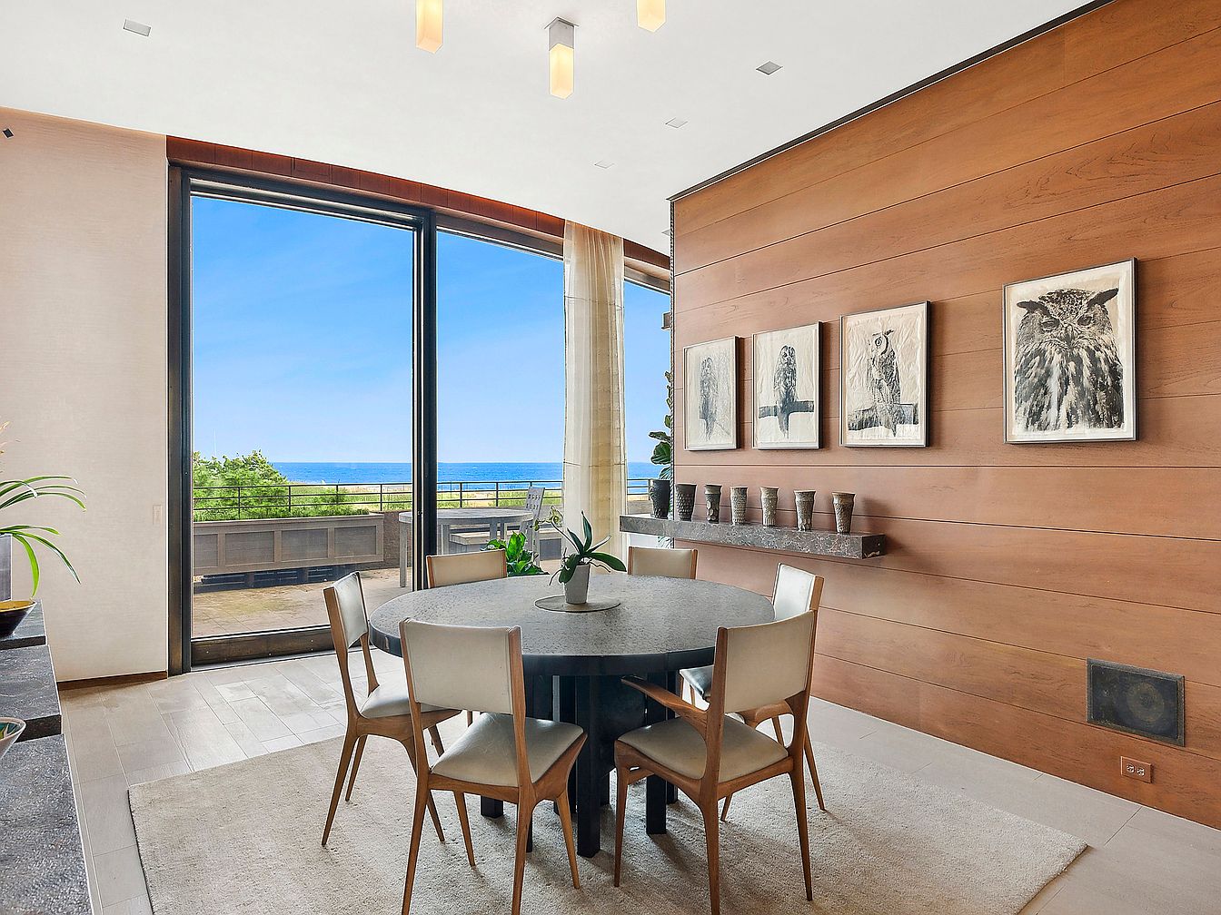 Spacious dining room featuring floor-to-ceiling windows that flood the area with natural light and offer a stunning ocean view, creating a tranquil and inviting atmosphere for gatherings. The space is anchored by a round dining table surrounded by modern wooden chairs with soft upholstery, ideal for family meals or entertaining guests. Warm wood paneling on one wall displays a series of tasteful, nature-inspired artworks, complemented by a sleek shelf adorned with decorative vases. Light neutral tones, a plush area rug, and minimalist decor enhance the room’s welcoming feel, ensuring comfort and style for all ages.