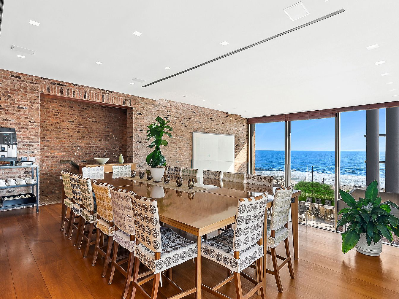 An airy, spacious dining area designed for family gatherings and memorable meals, featuring a large polished wood table surrounded by plentiful patterned chairs. The room’s aesthetic harmonizes rustic exposed brick walls with modern touches and floor-to-ceiling glass windows that flood the space with natural light and provide sweeping ocean views. Warm wooden floors add a cozy foundation, while indoor plants bring lively greenery to the interior. The layout encourages social interaction and comfort, making it perfect for large families or entertaining guests. Neutral earth tones blend with splashes of color from the coastal scenery and decor accents, creating a serene, welcoming ambiance.