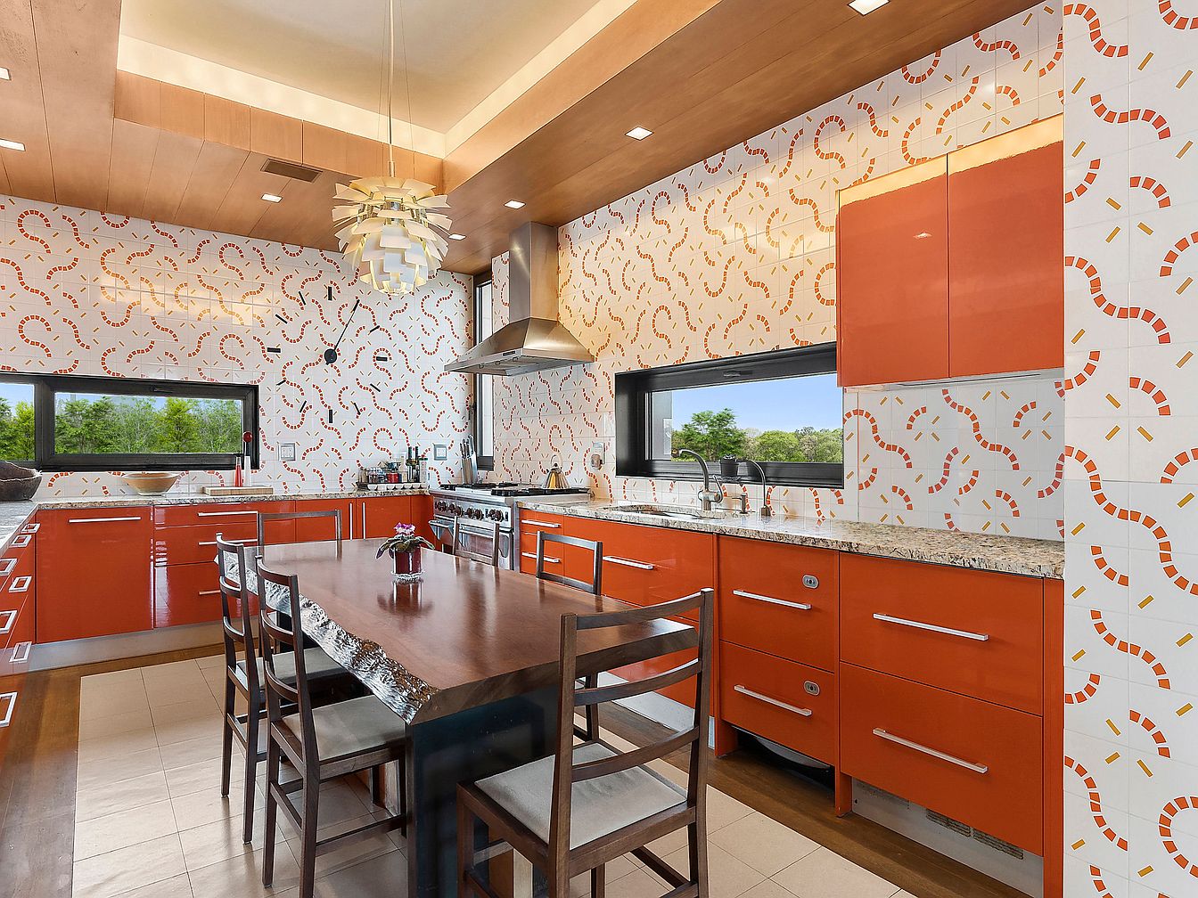 A spacious and inviting kitchen featuring bold orange cabinetry paired with sleek, polished hardware, introducing a vibrant and energetic atmosphere. Whimsical patterned wall tiles add visual interest and playfulness, making it appealing for family gatherings. The layout is open and functional, with a large central wooden dining table offering ample seating for casual meals or homework sessions. Granite countertops provide durability and style, while horizontal windows bring in natural light and highlight the surrounding greenery. Warm wood ceiling panels offer a cozy contrast to the contemporary finishes. Overall, the kitchen balances modern aesthetics with family-friendly practicality.