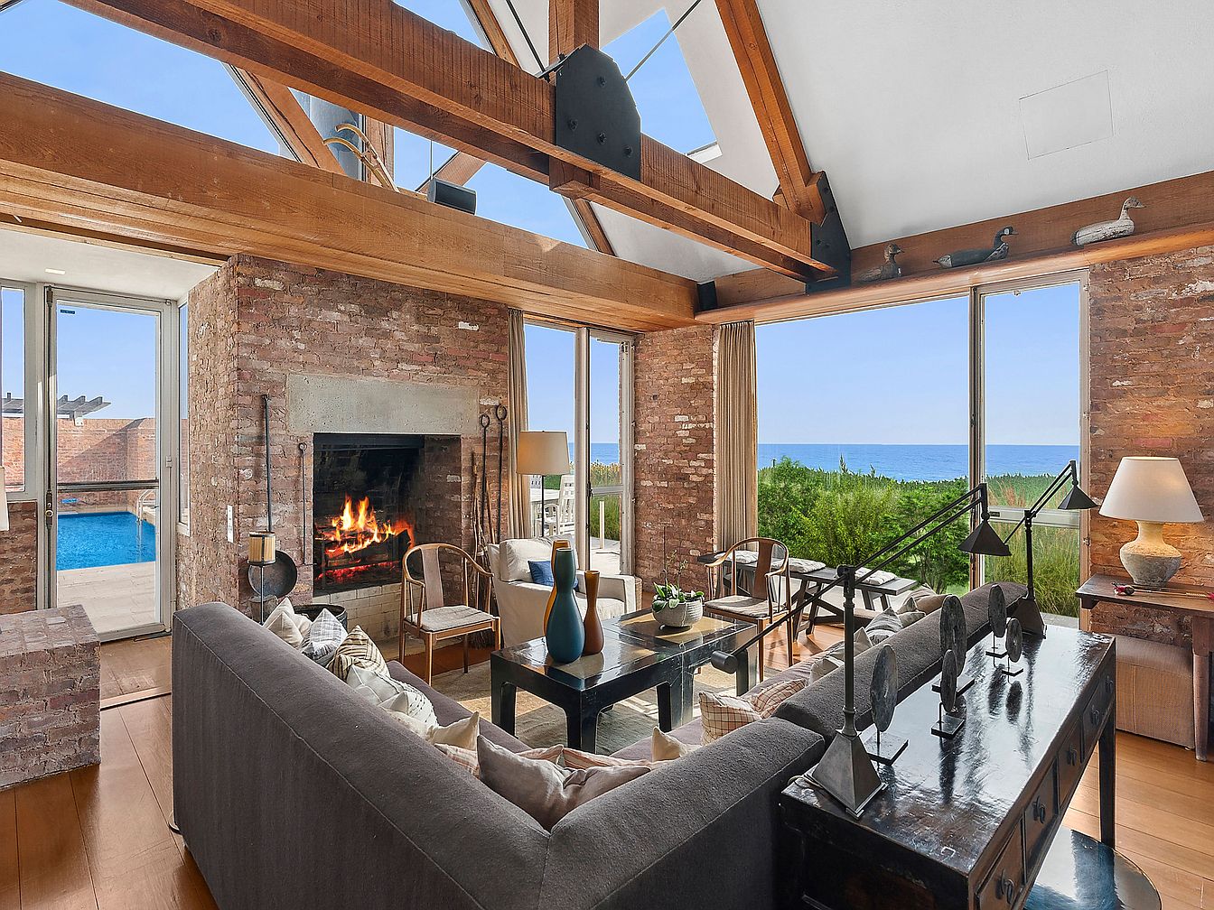 A warm, inviting living room combines rustic charm with modern sophistication, featuring exposed wooden beams, a vaulted ceiling, and expansive windows framing stunning ocean views. The space is built around a central brick fireplace, providing a cozy focal point for family gatherings. Comfortable sectional sofas and armchairs, adorned with neutral-toned pillows, encourage relaxation and conversation. Natural wood floors, brick walls, and a mix of modern and vintage furniture pieces provide a harmonious blend of textures. Ample natural light pours in, making the space both bright and welcoming, ideal for family activities, entertaining guests, or unwinding by the fire.