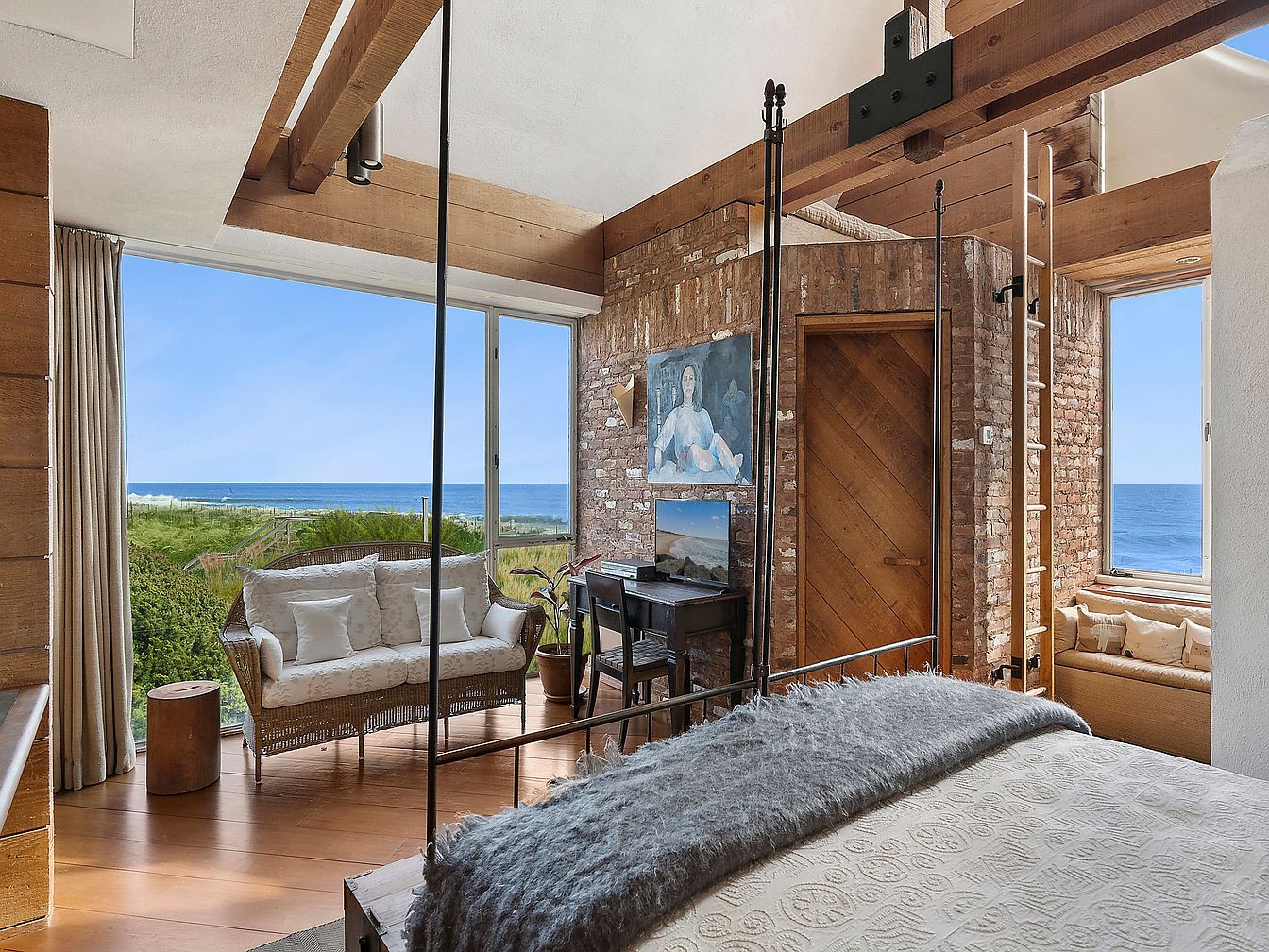 Bright and airy master bedroom featuring expansive floor-to-ceiling windows that showcase stunning ocean views and lush greenery, perfect for a serene and family-friendly retreat. Warm exposed brick walls, rustic wood beams, and a substantial solid wooden door highlight the natural, coastal-inspired aesthetic. A cozy window seat provides a quiet reading nook, while a soft cream loveseat and pale neutral bedding add comfort and relaxation. The space includes thoughtful details such as a writing desk, plush throws, and gentle, earthy tones throughout, making it an inviting sanctuary ideal for both restful nights and family gatherings.