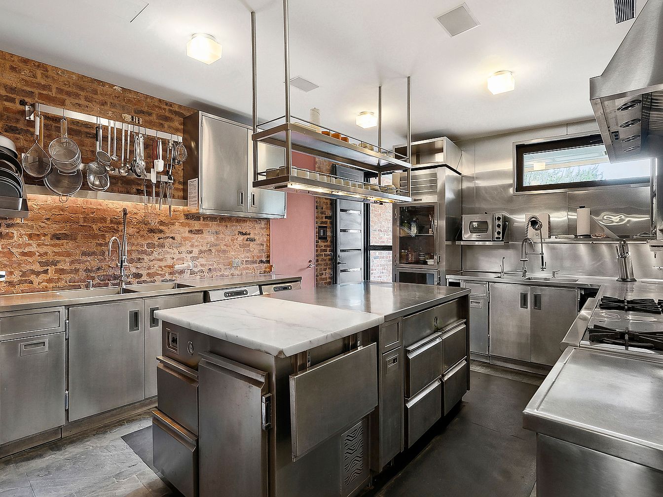 A chef-inspired kitchen stands out with sleek stainless steel surfaces, an expansive marble-topped island, and exposed brick walls that add warmth to the industrial aesthetic. The layout encourages efficient meal preparation with spacious countertops, double sinks, and open shelving for easy access to cookware and utensils. Ample storage, multiple ovens, and a restaurant-grade range make it ideal for preparing large family meals or entertaining guests. Natural light filters through a modern window, complementing the stone tile flooring. This functional, easy-to-clean kitchen beautifully blends durability and style, offering a family friendly space for cooking together or hosting gatherings.
