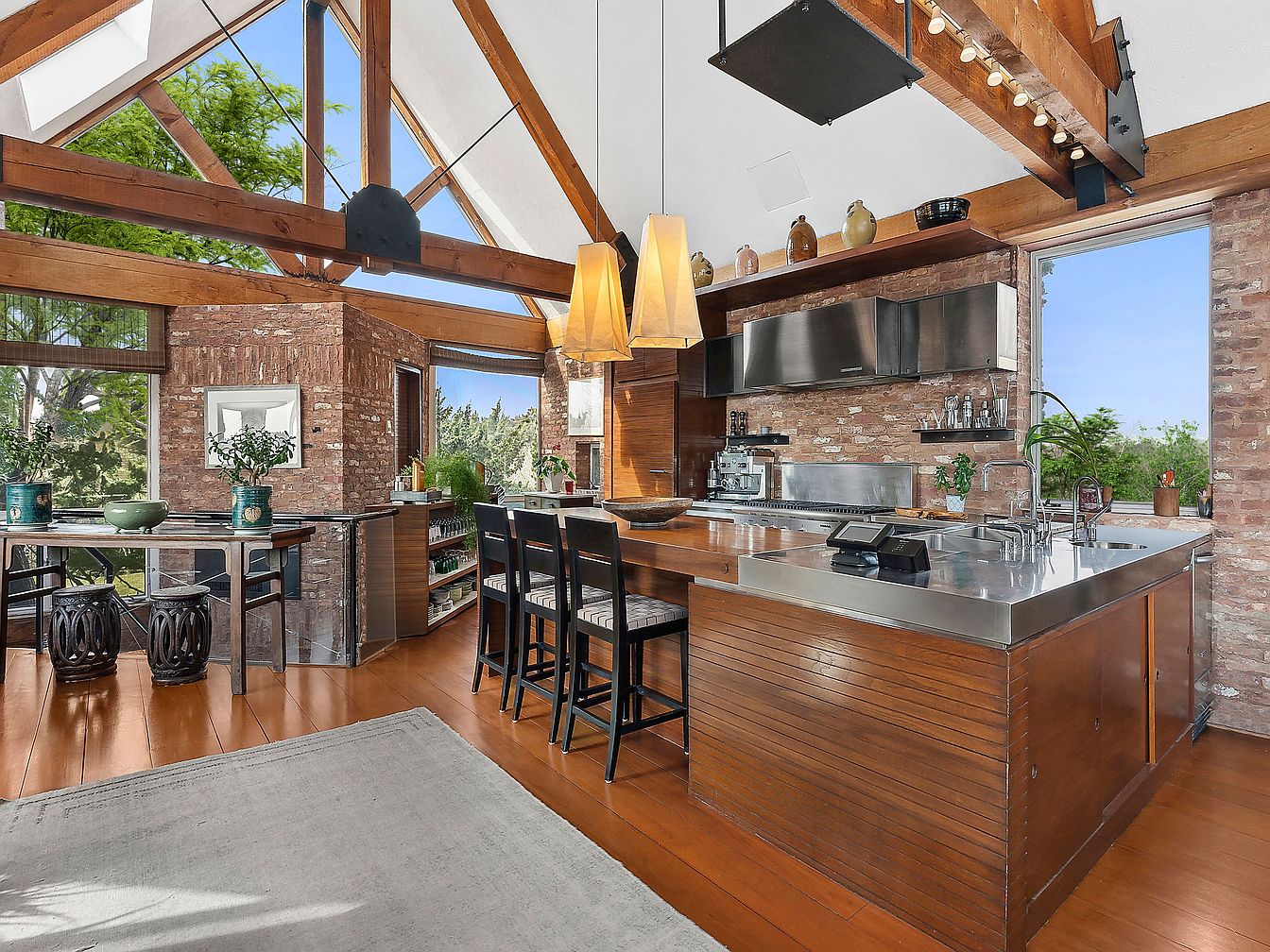 Vaulted ceilings with exposed wooden beams and large windows fill this kitchen with natural light, highlighting the rustic brick walls and rich wood cabinetry. The stainless steel countertops and appliances add a touch of modern industrial flair, while the breakfast bar with cushioned high-back chairs invites casual family meals or conversations. Open shelving displays stylish pottery and provides easy access to kitchen essentials, ideal for busy households. The open layout connects seamlessly to the living area, creating a social hub perfect for family gatherings. Warm earthy tones, lush greenery, and sleek pendant lights complete the inviting ambience, making this space both functional and aesthetically striking.
