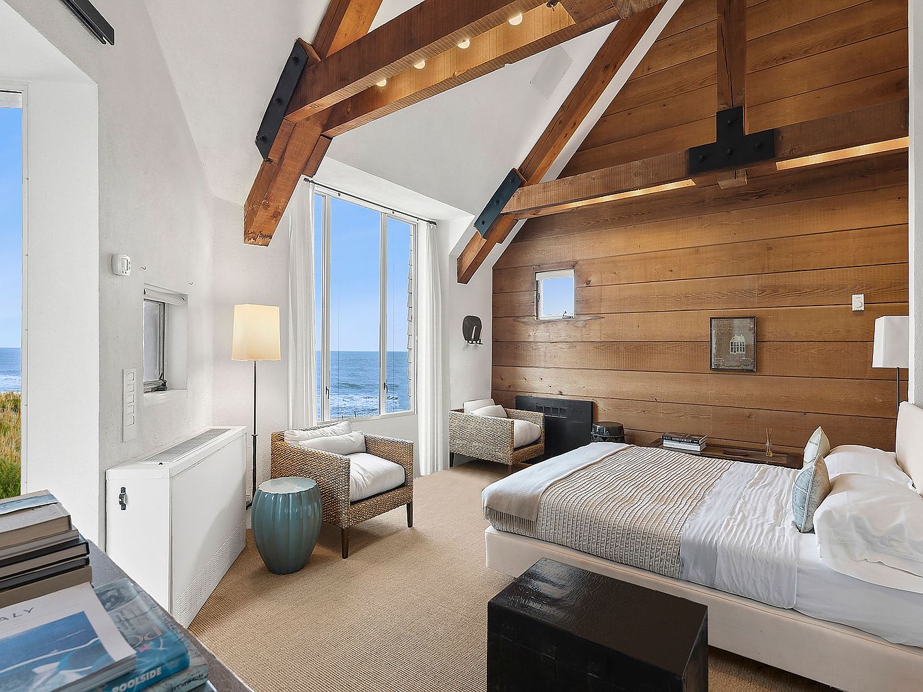 A spacious bedroom features exposed wooden beams and a striking wood-paneled accent wall, creating a warm, rustic ambiance. Soaring ceilings and expansive windows invite natural light and provide breathtaking ocean views. Neutral hues dominate the color palette, with beige carpeting, white walls, and soft-colored bed linens promoting relaxation. Cozy armchairs positioned by the window make for an inviting reading nook, perfect for unwinding as a family. Minimalist décor keeps the space clutter-free, while thoughtfully placed furniture ensures functionality and comfort. This serene coastal bedroom seamlessly blends architectural charm with practical, family-friendly design, making it an inspiring sanctuary for all ages.