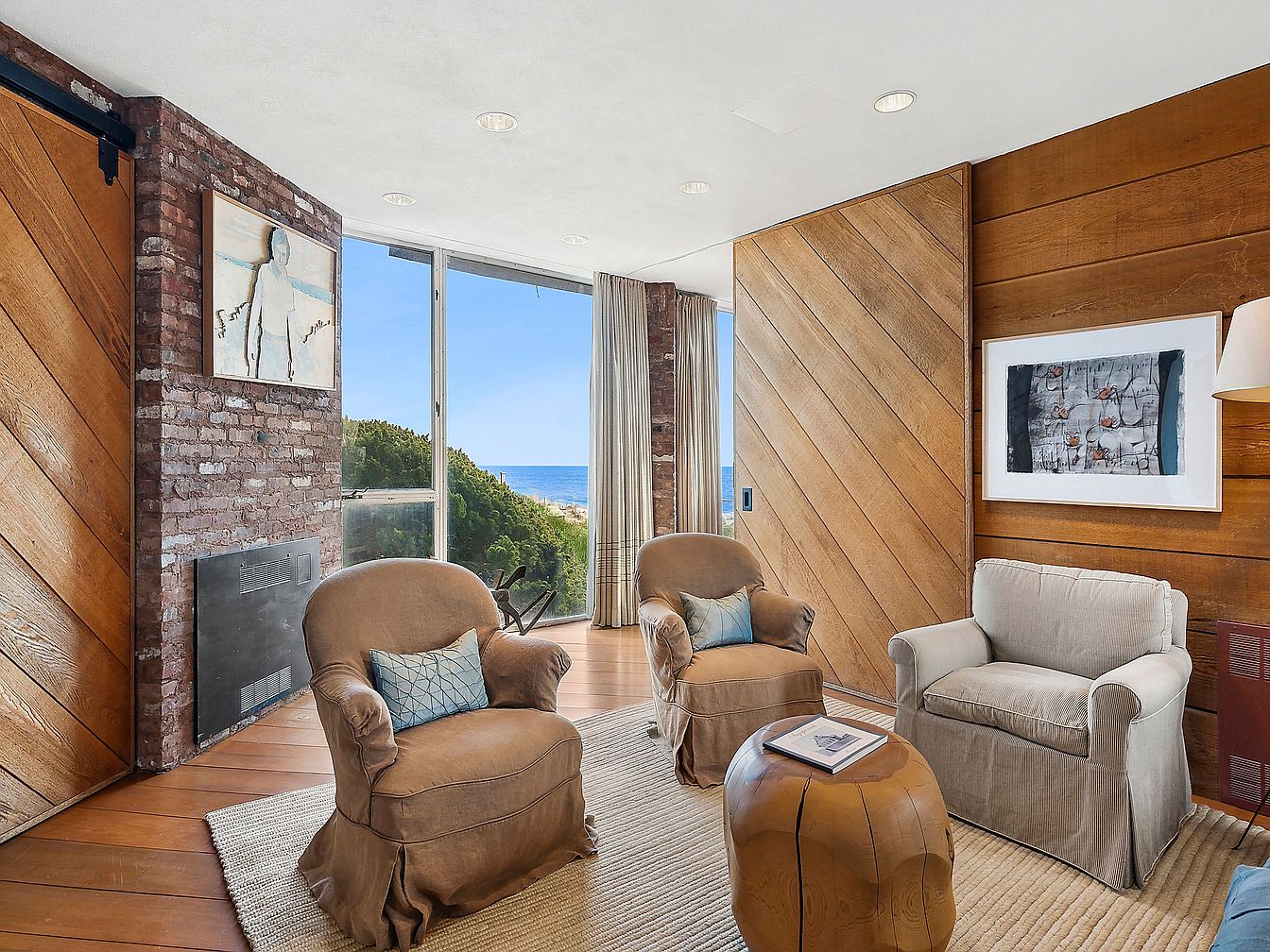 Warm wood paneling and exposed brick showcase a blend of natural textures in this intimate sitting area, with large windows framing stunning ocean views. Comfortable armchairs and a soft loveseat provide inviting spots for family conversations or quiet reading, centered around a modern, sculptural coffee table. The neutral palette of beige, tan, and soft grey enhances a calm ambience, suitable for both relaxation and gatherings. Artworks add character without overwhelming the space. The room’s clean lines, sliding glass doors, and abundance of natural light create a harmonious, family-friendly retreat designed for everyday comfort and inspiration.