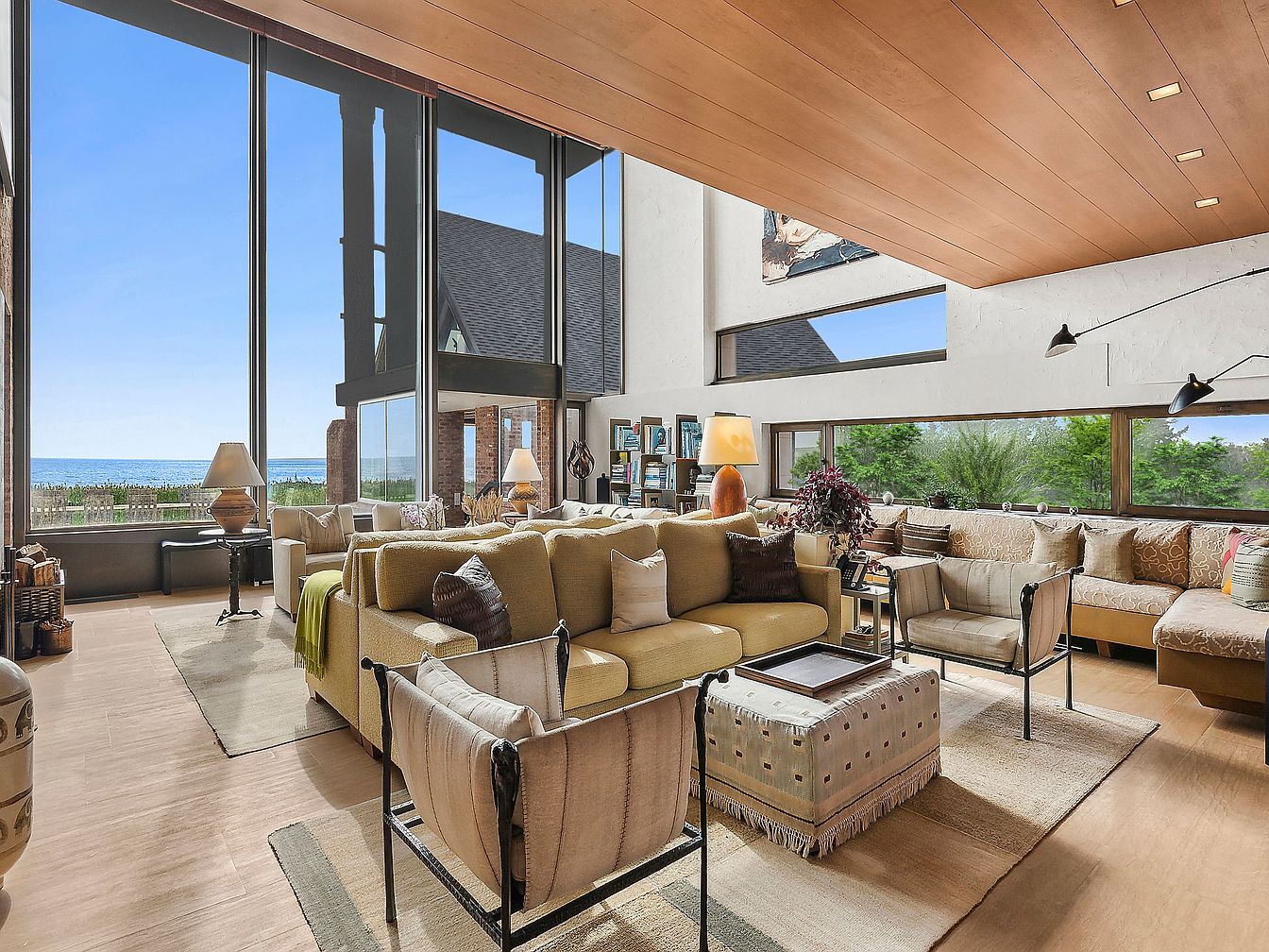 Spacious and inviting, this living room features soaring floor-to-ceiling windows that fill the space with natural light and offer breathtaking views of the ocean and garden. An open layout encourages conversation, with ample seating provided by sofas, armchairs, and a built-in window bench, all in warm, neutral tones accentuated with earth-colored throw pillows and blankets. The wooden ceiling and soft area rugs add a cozy, family-friendly touch, while modern lamps, layered lighting, and curated decor pieces create an atmosphere that is both elegant and comfortable for gatherings and relaxation.