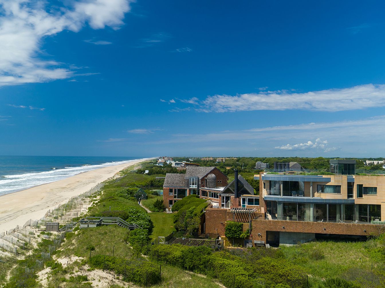 A stunning view of the beachfront exterior highlights modern architectural lines mingling with classic Hamptons charm. The home’s multi-level design and expansive windows embrace abundant natural light and uninterrupted ocean vistas, making it ideal for family gatherings and entertaining. Thoughtful landscaping weaves natural dune grasses and manicured hedges into the property, ensuring privacy while maintaining effortless beach access. Outdoor living spaces, including broad terraces and sheltered patios, invite al fresco dining and relaxation. Neutral sandy tones paired with exposed brick and glass elements create a harmonious blend with the coastal setting, fostering a serene and welcoming environment for all ages.