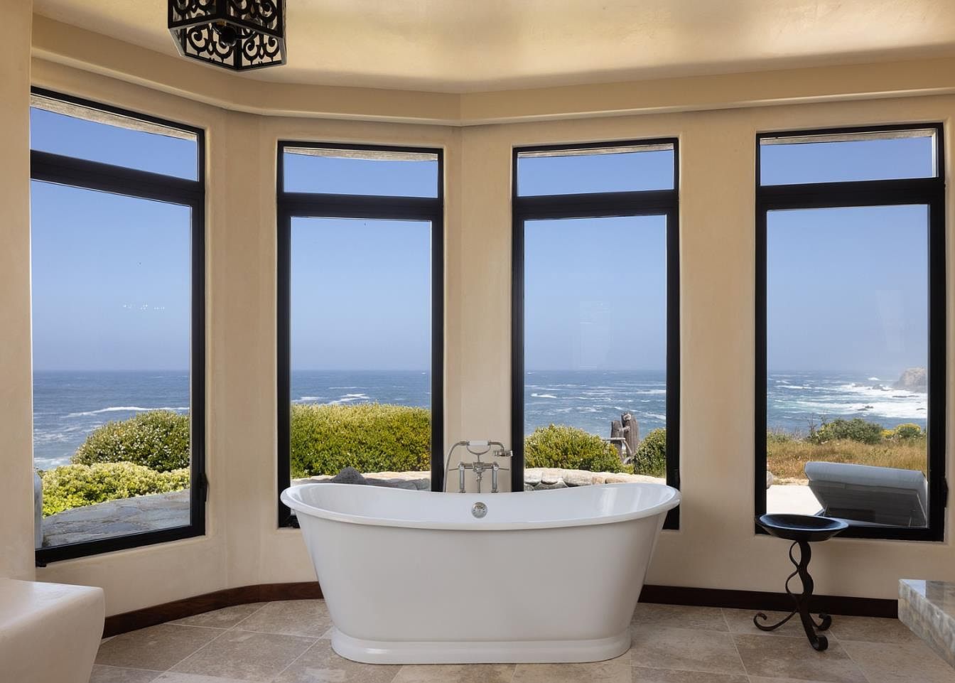 This elegant bathroom features a freestanding soaking tub positioned between expansive windows, allowing for breathtaking views of the ocean. The contemporary design employs soft neutral tones, complemented by luxurious stone flooring that adds warmth to the space. Natural light floods through the large panes, accentuating the clean lines and modern fixtures. The minimalist décor is enhanced by a stylish pendant light that casts a gentle glow, creating a serene atmosphere. With ample space and family-friendly layouts, this inviting area blends relaxation with stunning natural beauty, perfect for unwinding after a long day.