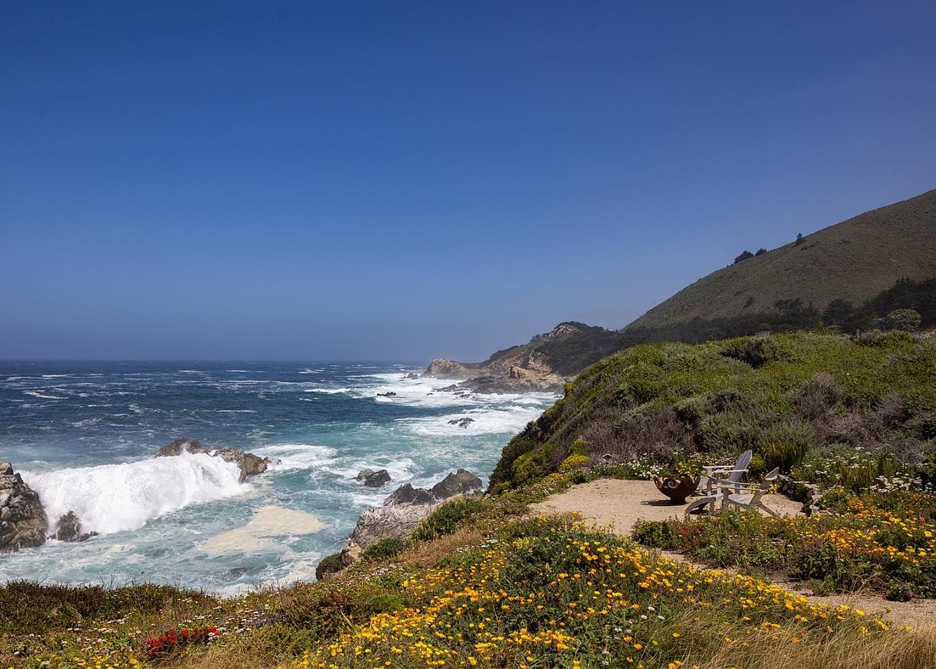 A serene coastal garden retreat unfolds, harmoniously blending natural beauty with comfort. Vibrant wildflowers in hues of orange and yellow create a cheerful border, framing a tranquil seating area that invites relaxation. A charming fire pit adds warmth, perfect for gatherings under the vast, blue sky. The sound of crashing waves provides a soothing soundtrack while the lush greenery flows seamlessly into the rugged coastline. Ideal for family gatherings or quiet evenings, this outdoor space encourages connection with nature. The inviting layout enhances outdoor living, making it an ideal inspiration for anyone dreaming of a coastal home.