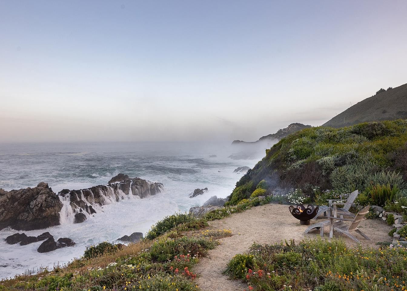 This serene coastal outdoor space features an inviting arrangement of weathered wooden chairs set against a breathtaking backdrop of crashing waves and rugged cliffs. Soft, sandy pathways wind through vibrant native flora, enhancing the natural beauty of the setting. A stylish fire pit offers warmth for evening gatherings, perfect for family and friends to share stories under the starlit sky. The soothing color palette blends earthy tones of greens and browns with the soft blues of the ocean, creating a tranquil atmosphere. This idyllic spot seamlessly integrates comfort and nature, making it a perfect retreat for relaxation.