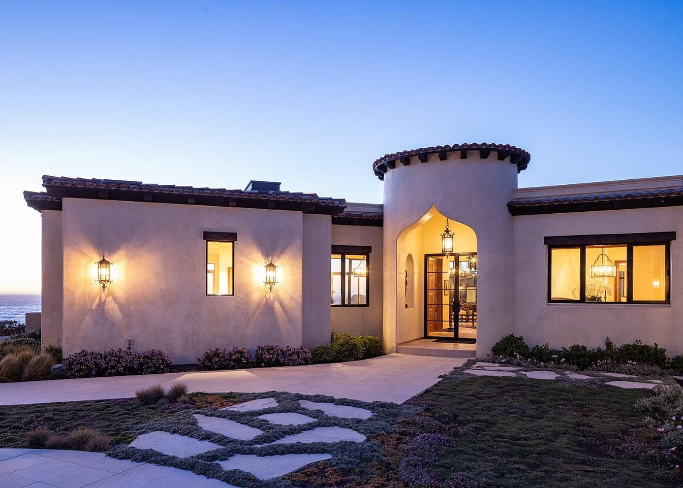 The captivating entrance features an elegant arched doorway framed by decorative lanterns, accentuating the home’s Mediterranean style. Smooth stucco walls painted in warm, neutral tones enhance the inviting atmosphere, while the rich details of the terracotta roof add a touch of rustic charm. The path, adorned with stone pavers and lush greenery, guides visitors through a vibrant landscape bursting with flowering plants. Large windows allow natural light to flood the interior, connecting the indoor and outdoor spaces seamlessly. This thoughtfully designed entryway is both functional and stylish, welcoming family and friends with sophistication and warmth.