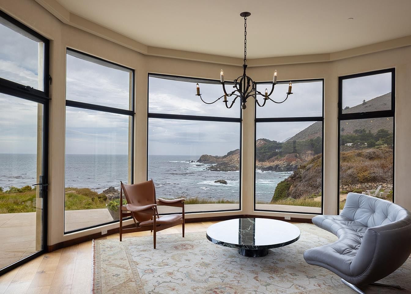 This stunning living room features expansive floor-to-ceiling windows that offer breathtaking views of the ocean and surrounding landscape. The inviting layout incorporates a blend of modern furniture, including a sleek gray sofa and a classic leather chair, centered around a unique marble coffee table. The soft, neutral color palette enhances the airy atmosphere, while warm wooden flooring adds a touch of comfort. A stylish chandelier hangs from the ceiling, complementing the room’s elegant design while providing ample lighting. This space is ideal for family gatherings, encouraging relaxation while immersing in the natural beauty beyond.
