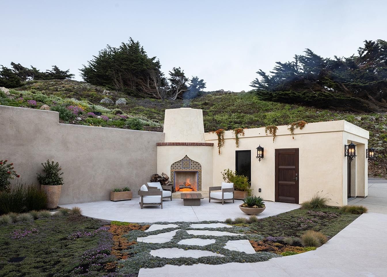This inviting outdoor living area seamlessly blends comfort and nature. The focal point is a stunning fireplace adorned with intricate tile work, creating a warm atmosphere for gatherings. Surrounding the fireplace, stylish seating invites relaxation, while the desert-inspired landscaping adds vibrant splashes of color with drought-resistant plants. Pathways meander gracefully through a lush ground cover, enhancing the space’s organic feel. Soft architectural lines and a neutral color palette, accented by traditional lanterns, evoke a serene ambiance. Ideal for family gatherings, this design encourages outdoor living, relaxation, and connection with nature, making it a perfect retreat.