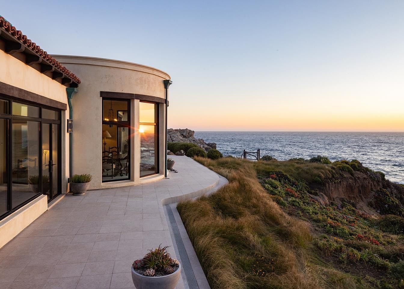 This stunning coastal patio seamlessly melds indoor and outdoor living, featuring expansive glass windows that invite natural light and showcase breathtaking ocean vistas. The modern design includes smooth stone flooring and soft, natural colors, creating a serene atmosphere. Comfortable seating areas are positioned to maximize views of the sunset, making it perfect for family gatherings or relaxing evenings. Lush landscaping cascades down the cliffs, enhancing the natural beauty surrounding the home while offering a sense of privacy. Attention to detail is apparent, with stylish planters adding to the inviting aesthetic, ideal for entertaining or simply enjoying nature’s tranquility.