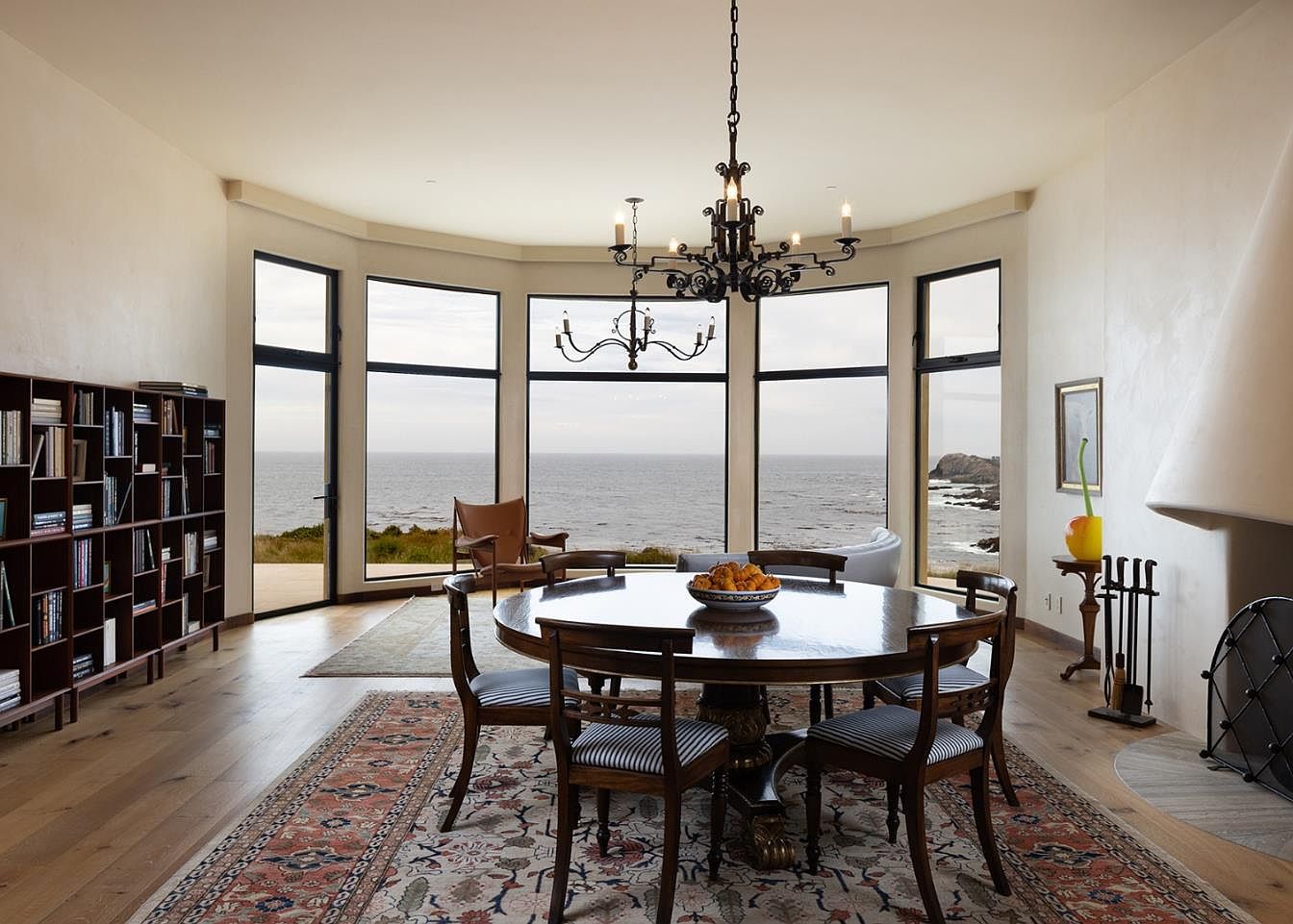 A stunning dining room that blends elegance with coastal charm, featuring a large round table surrounded by classic wooden chairs, elegantly upholstered for comfort. The room is bathed in natural light from floor-to-ceiling windows, offering breathtaking ocean views. A magnificent chandelier hangs from the curved ceiling, casting a warm glow over the space. The floors are adorned with a rich Persian rug, adding warmth and color to the neutral palette. Bookshelves line one wall, inviting family gatherings and quiet reading time. A comfortable armchair invites relaxation, while the positioning offers both functionality and aesthetics.