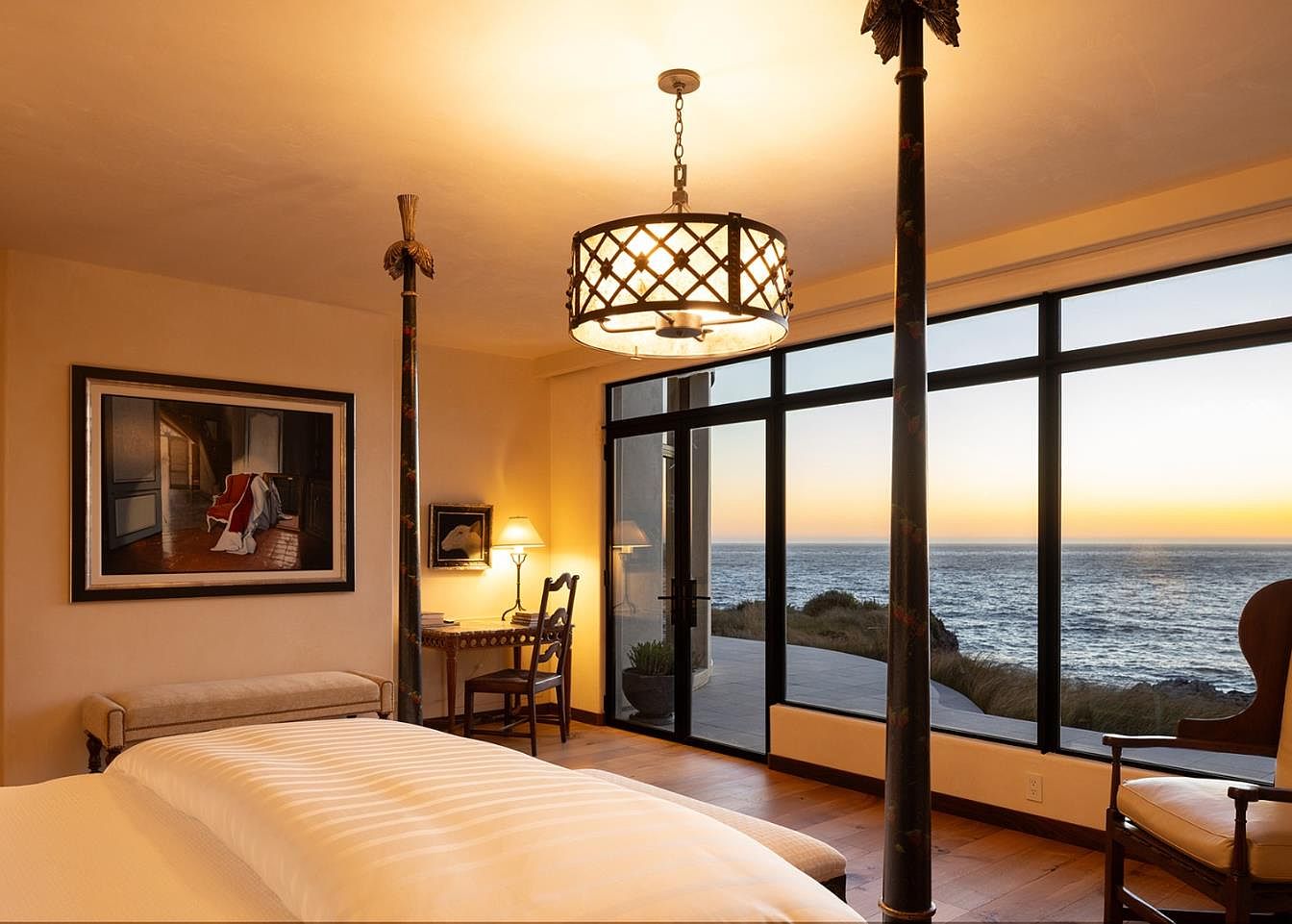 This coastal master bedroom features floor-to-ceiling windows that frame breathtaking ocean views, flooding the space with natural light. The soft, warm color palette creates a tranquil atmosphere, while the luxurious king-size bed is adorned with crisp white linens. An elegant chandelier adds a touch of sophistication, complemented by unique decorative elements such as floral-painted posts. A cozy seating area includes a stylish armchair and a vintage writing desk, ideal for relaxation or creative pursuits. Thoughtfully placed artwork enhances the ambiance, making it a perfect retreat for both family bonding and personal rejuvenation.