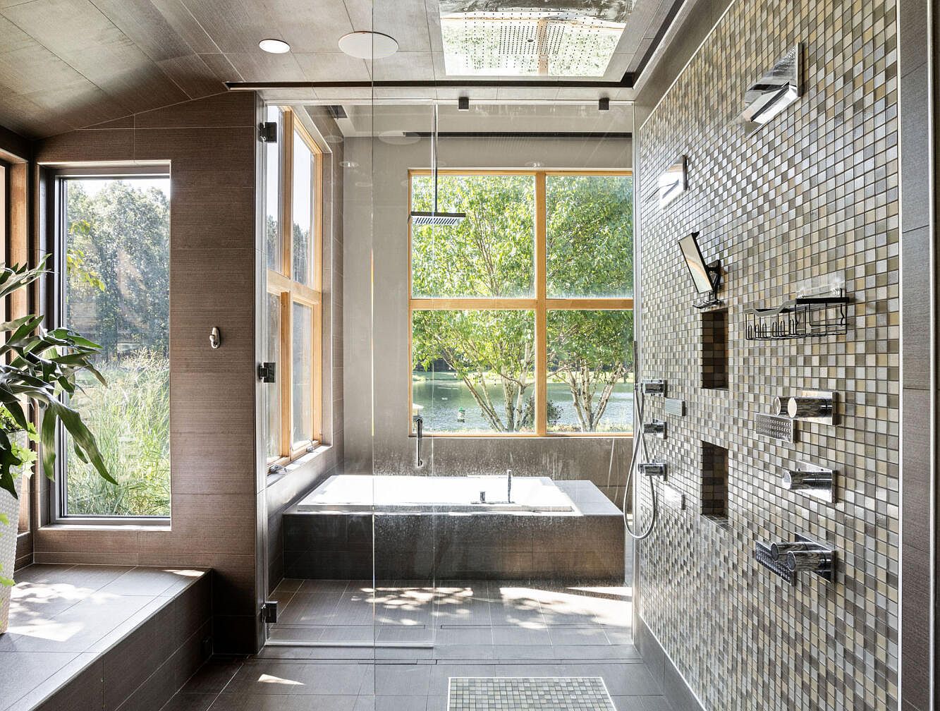 A luxurious spa-inspired bathroom filled with natural light thanks to expansive windows overlooking tranquil outdoor views. The large walk-in shower features contemporary mosaic tiles in a soothing palette of grays and beige, equipped with multiple rainfall and body showerheads for a relaxing experience. A deep soaking bathtub is perfectly positioned for enjoying the scenery, framed by wood-trimmed windows. The room’s modern aesthetic is complemented by clean lines, built-in shelving, and sleek chrome fixtures. A potted plant brings a touch of greenery, while the bench seating and spacious layout make this an inviting and family-friendly oasis for unwinding together.