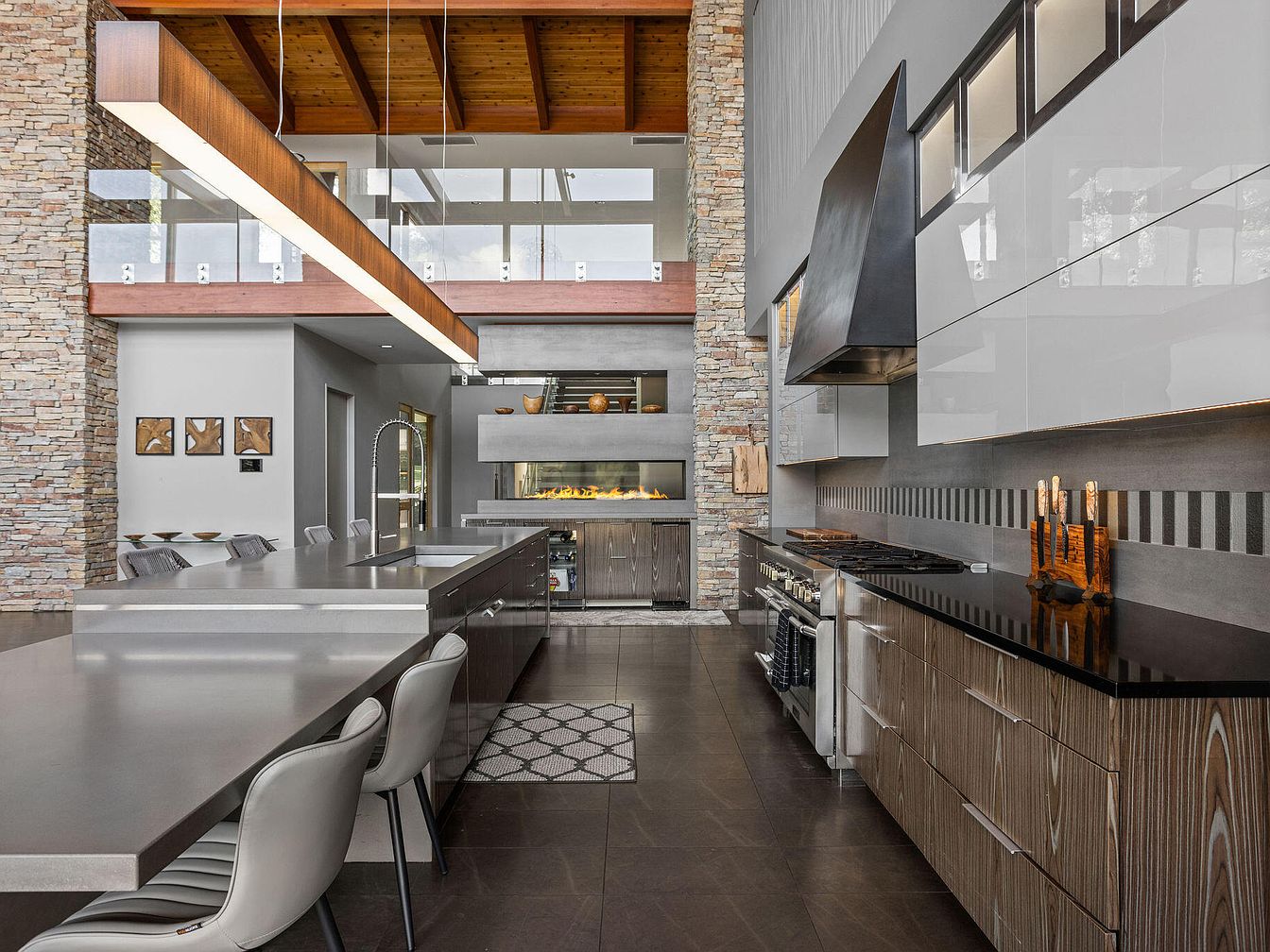 A spacious, contemporary kitchen blends natural textures with minimalist design. The layout features a large central island with ample seating, perfect for family gatherings and casual meals. Sleek cabinetry in a woodgrain finish pairs with glossy upper cabinets, creating a harmonious mix of warmth and modern sophistication. Stone accent walls and an open double-height ceiling with exposed wood beams add architectural drama, while a dramatic linear pendant provides ample lighting. A high-end range, modern backsplash, and generous countertop space cater to home chefs. The neutral color palette, accented with black and soft grays, ensures timeless family appeal and easy everyday living.