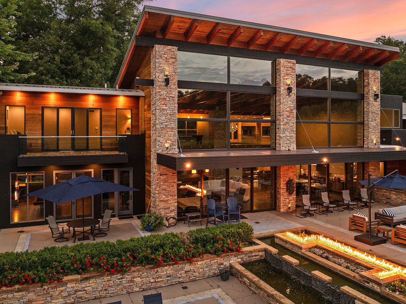 A contemporary outdoor living area designed for both relaxation and entertaining, featuring a spacious patio with comfortable seating and dining spaces under large umbrellas. Expansive floor-to-ceiling windows create a seamless transition between indoor and outdoor spaces, allowing natural light to flood into the home. The warm wooden accents, stacked stone columns, and modern architectural lines enhance the inviting atmosphere. A stunning linear fire feature, surrounded by lush landscaping and a reflecting pool, serves as a focal point for gatherings. Ample space for kids to play and secure seating options make this a family-friendly zone for all ages.