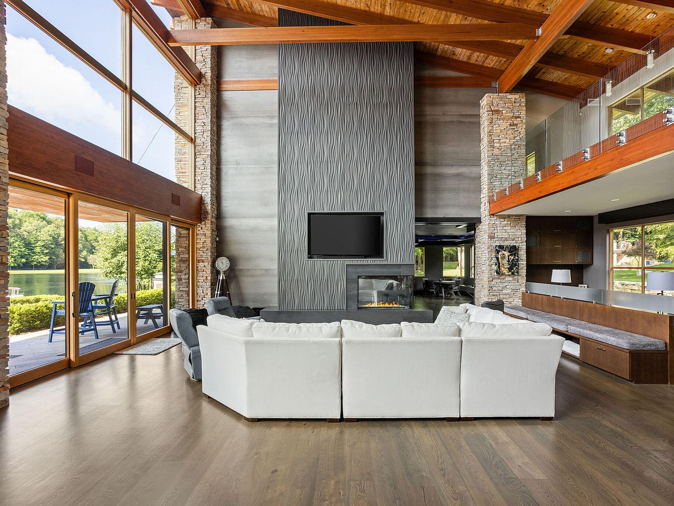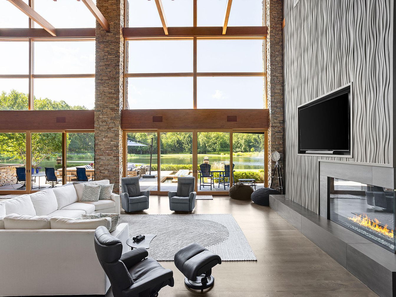Expansive floor-to-ceiling windows fill this spacious living room with natural light and provide a stunning view of the lakeside landscape. The modern open layout is perfect for family gatherings, featuring a large white sectional sofa arranged for comfort and conversation. Contemporary swivel chairs and a round textured rug add style while remaining practical for all ages. A sleek linear fireplace and 3D textured accent wall create a sophisticated focal point, complemented by light wooden floors and stone columns. The access to an outdoor patio invites seamless indoor-outdoor living, ideal for entertaining or relaxed family time among nature.