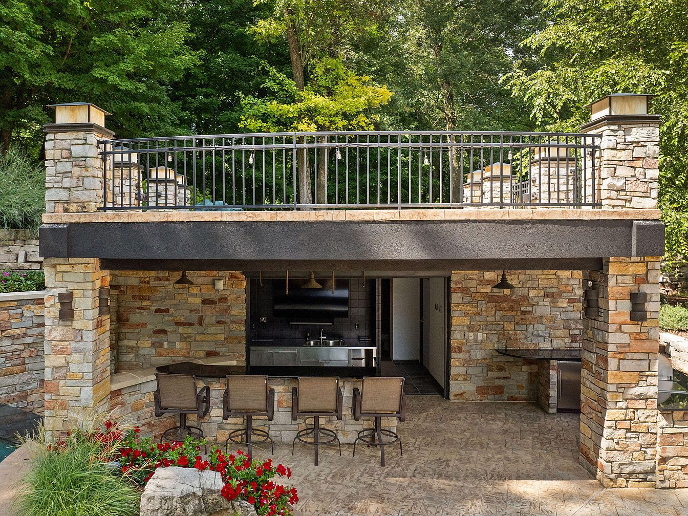 This inviting outdoor kitchen bar features a sturdy stone structure with earthy tones that blend seamlessly into the surrounding garden landscape. The covered space boasts a sleek stainless-steel kitchenette for easy meal prep and entertaining, complemented by a dine-in bar counter with comfortable seating for four. Warm stonework, industrial lighting, and an overhead terrace with wrought iron railing create an appealing mix of rustic and modern design. Ample space offers room for family gatherings or celebrations. Colorful flowerbeds and natural greenery surround the area, making it a perfect family-friendly hub for outdoor dining and social enjoyment.