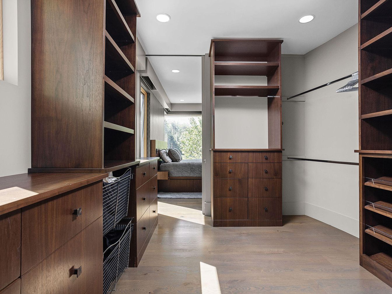 Spacious walk-in closet featuring custom-built dark wood shelves and drawers, which offer abundant storage for clothing, shoes, and accessories, making it easy for families to stay organized. Open shelving provides versatile display space, while a series of drawers and wire baskets help limit clutter and increase functionality. Neutral-colored walls paired with light wood flooring create a contemporary, airy feel, enhanced by ample natural light streaming in through a nearby window. Recessed lighting in the ceiling ensures visibility throughout the day. An open layout ensures easy traffic flow and direct access to the adjoining bedroom, perfect for busy family routines.