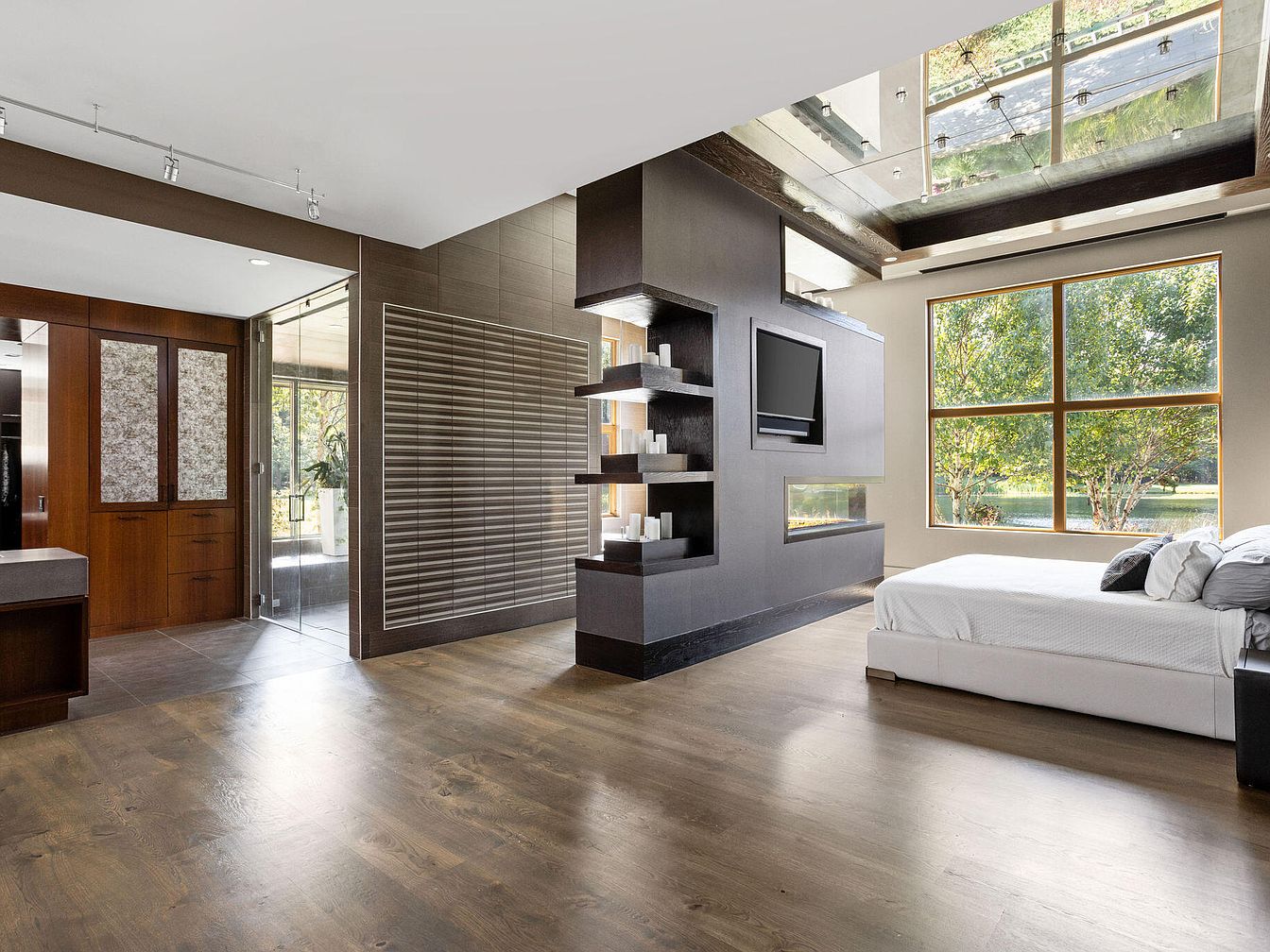 A spacious master bedroom flooded with natural light from tall windows, offering serene views of lush greenery. The open-layout design blends relaxation and functionality, featuring warm wooden flooring that provides a comfortable surface for families with children. Modern shelving and a sleek fireplace wall add architectural interest, subtly dividing the room while offering display and storage space. Neutral tones, soft bedding, and plush pillows invite rest and tranquility. The connection to an elegant ensuite bath through frosted glass doors ensures convenience, making the area perfectly suited for everyday family living and moments of quiet retreat.