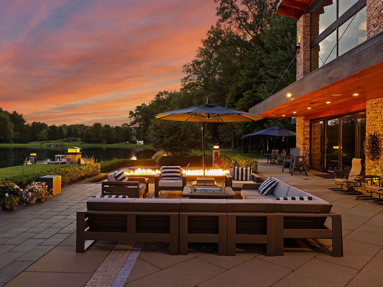 A spacious lakeside patio seamlessly blends comfort and style, perfect for gatherings or quiet sunsets. Plush sectional sofas in deep gray are arranged around a sleek, rectangular fire pit, creating a cozy centerpiece for evening relaxation. Striped navy and white accent pillows add a brisk nautical charm. Large umbrellas provide shade for daytime lounging, while meticulously landscaped flower beds and manicured hedges frame the sitting area. The patio flows effortlessly from the home’s stone and wood exterior, with warm lighting accentuating architectural details and large glass doors opening to indoor living spaces, making it inviting and family-friendly.