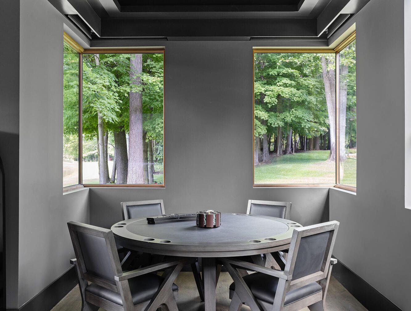 A cozy dining nook features a round wooden table surrounded by six matching chairs, ideal for both intimate family meals and gatherings. Floor-to-ceiling windows on two sides flood the space with natural light while providing serene panoramic views of a lush green forest, blurring the lines between indoors and outdoors. The room displays a modern aesthetic with a cool gray color palette and clean lines, creating a calm, understated elegance. The open layout encourages conversation and inclusivity, making it perfect for families. The architectural details, including deep window sills and a dark, coffered ceiling, add depth and sophistication.