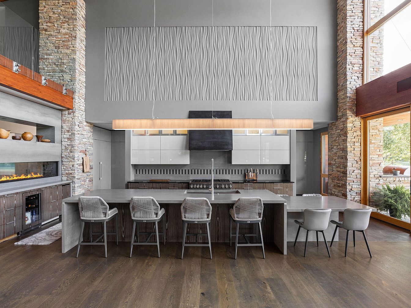 An expansive open-plan kitchen features a striking central island that invites family gatherings and casual dining. The design blends natural stone walls with expansive glass windows, filling the room with light and showcasing outdoor views. Warm wooden floors balance cool gray cabinetry and countertops, while sleek barstools and contemporary chairs add comfortable, family-friendly seating. Textured wall art and a linear pendant light create visual interest and modern flair. The kitchen flows seamlessly into a cozy lounge area with a linear fireplace, making the space perfect for entertaining and daily living. Practical layout and durable surfaces enhance both style and function.