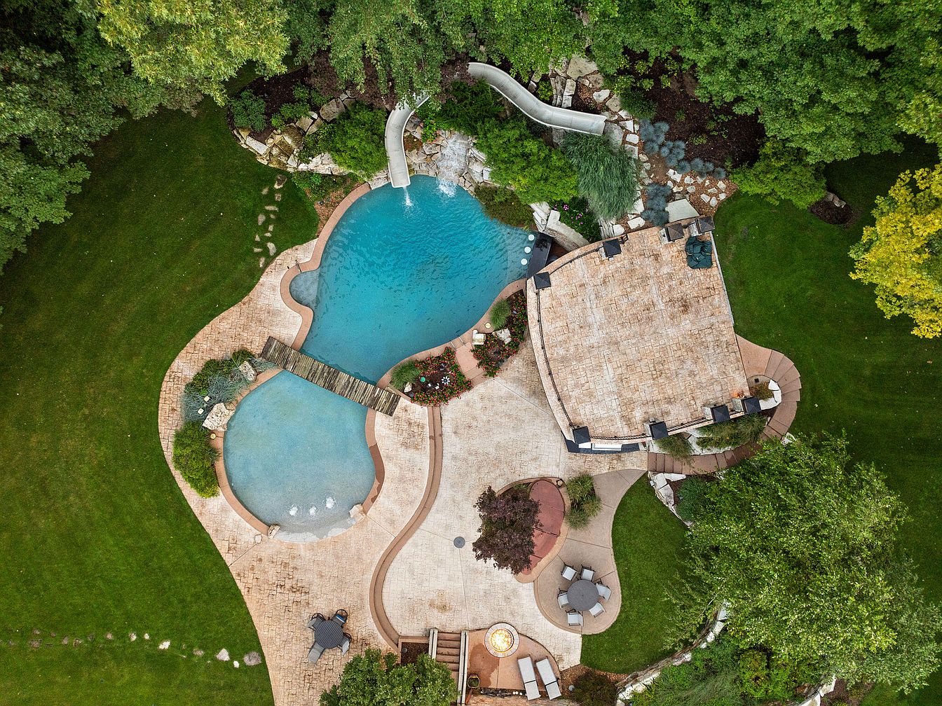 A serene backyard retreat unfolds with a beautifully designed swimming pool featuring organic, freeform curves bordered by lush green lawns and mature trees. A wooden footbridge elegantly crosses a shallow lounging area, perfect for families with young children. Tall trees and vibrant landscaping offer a sense of privacy and tranquility. The pool area is complemented by a large patio with ample seating, shaded dining spaces, and a cozy circular fire pit ideal for gatherings. The surrounding stone walkways, natural rock features, and waterslide add architectural interest and playful elements for both adults and kids, making this space perfect for relaxation and entertaining.