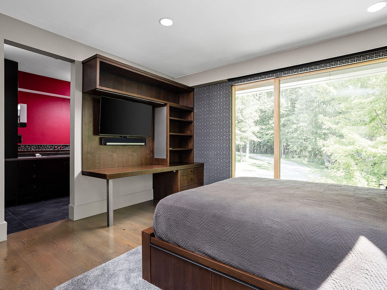 A bright bedroom features a sleek built-in workspace crafted from rich wood, providing shelving and a desk beneath a mounted flat-screen TV. The expansive window floods the room with natural light and offers serene views of lush, green trees, while a textured wallpaper adds depth to the space. A spacious bed with a gray cover anchors the room, making it both cozy and functional for families. The open layout promotes easy movement, with direct access to an adjacent room with bold red accent walls, seamlessly connecting private and shared family areas in an inviting, modern retreat.