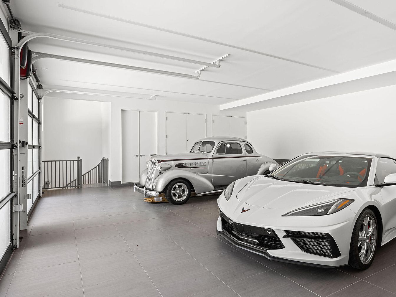 Sleek and spacious garage designed for car enthusiasts and family convenience. Clean lines and neutral gray tones run throughout, with polished tile flooring that is both stylish and easy to maintain. Full-width glass-paneled garage doors invite ample natural light, enhancing the airy feel. Features include ample parking for multiple vehicles, integrated storage closets, and direct stair access to the rest of the home—ideal for busy families. The uncluttered design and modern lighting strip create a showroom-like ambiance, while the open layout ensures safety and ease of navigation for all family members, including children. This garage blends functionality with contemporary sophistication.
