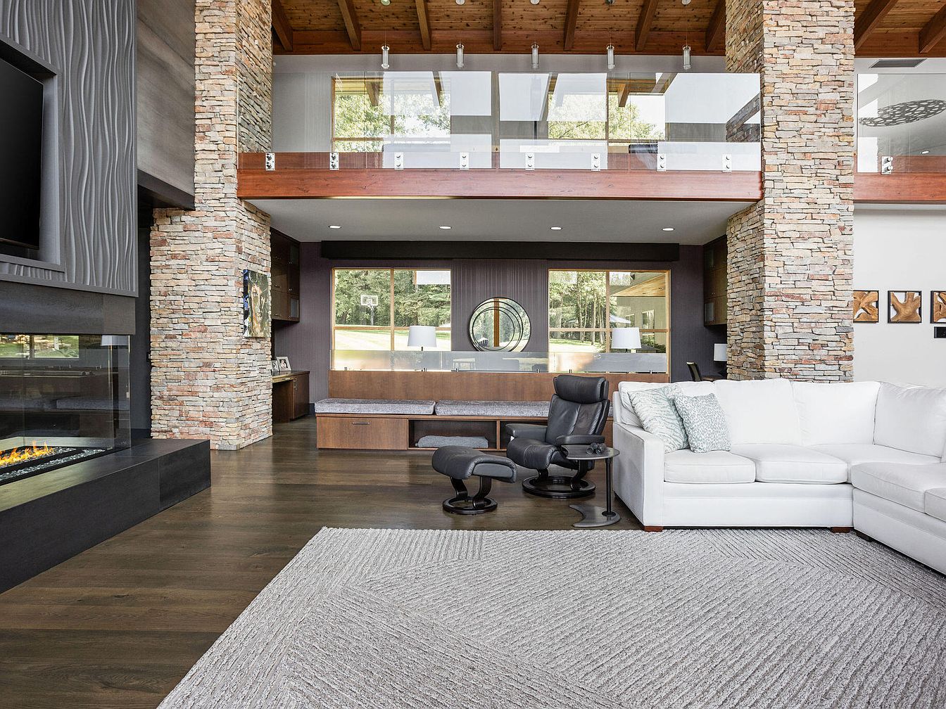 This spacious living room is designed with a harmonious blend of modern and rustic elements, featuring floor-to-ceiling stone columns that frame the space and a contemporary fireplace with textured detailing. A cozy white sectional sofa and inviting recliner provide ample seating for family gatherings. The expansive windows bring in natural light, offering a seamless connection to the outdoors. Wood accents, both in the ceiling beams and built-in cabinetry, create warmth, while the open mezzanine and glass railing above add airiness. Neutral tones, layered textures, and strategic layout ensure both stylish comfort and a family-friendly environment perfect for relaxation and socializing.