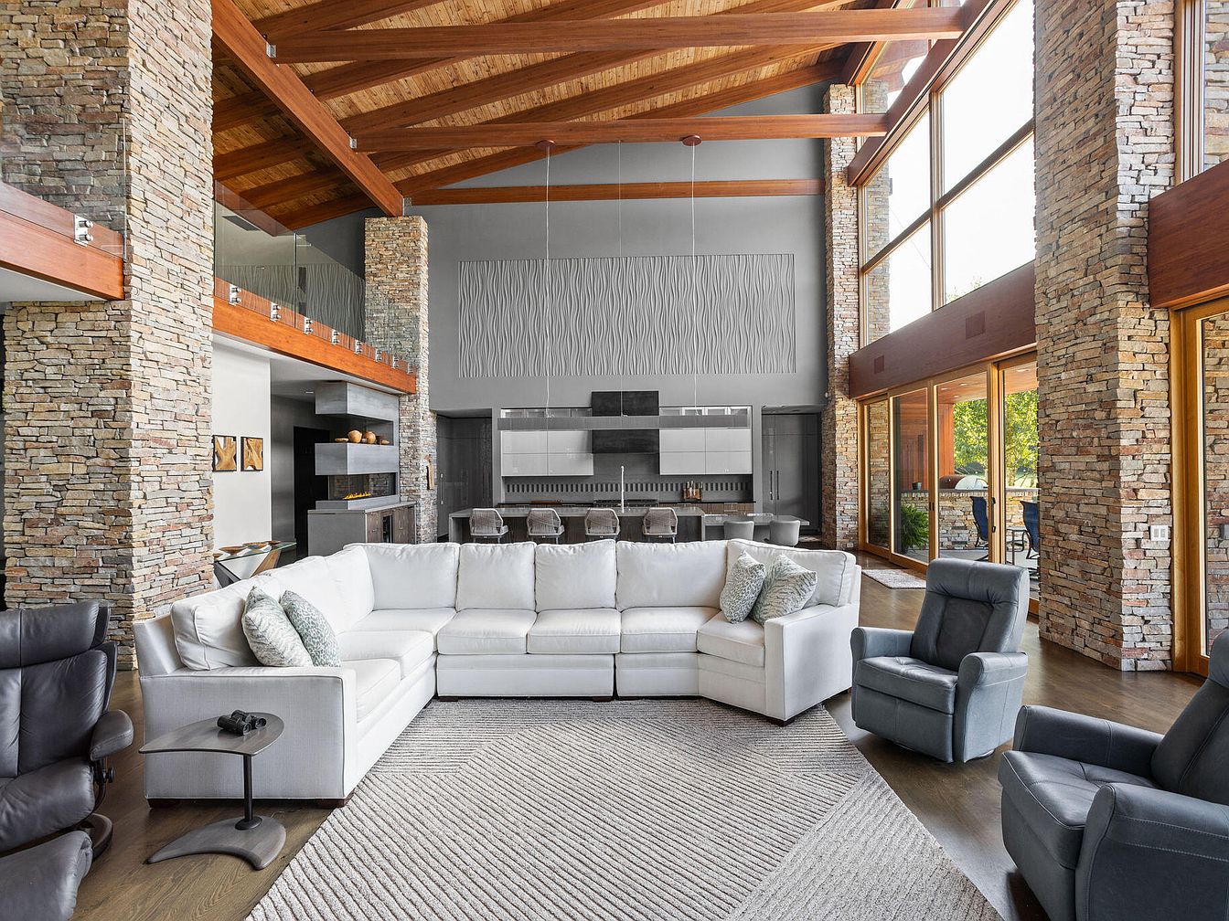 Expansive open-concept living room featuring soaring ceilings with exposed wooden beams and tall stone columns that add rustic elegance. Floor-to-ceiling windows fill the space with natural light and offer tranquil views of the outdoors, making it inviting for families and guests. A plush white sectional couch sits atop a textured, neutral rug, providing ample, comfortable seating for gatherings or relaxing. Modern recliners in soft gray frame the seating area for extra coziness. The airy space seamlessly connects to a contemporary kitchen, facilitating easy entertaining and supervision of children, while the warm, earthy color palette creates a welcoming atmosphere accented by natural materials and modern touches.