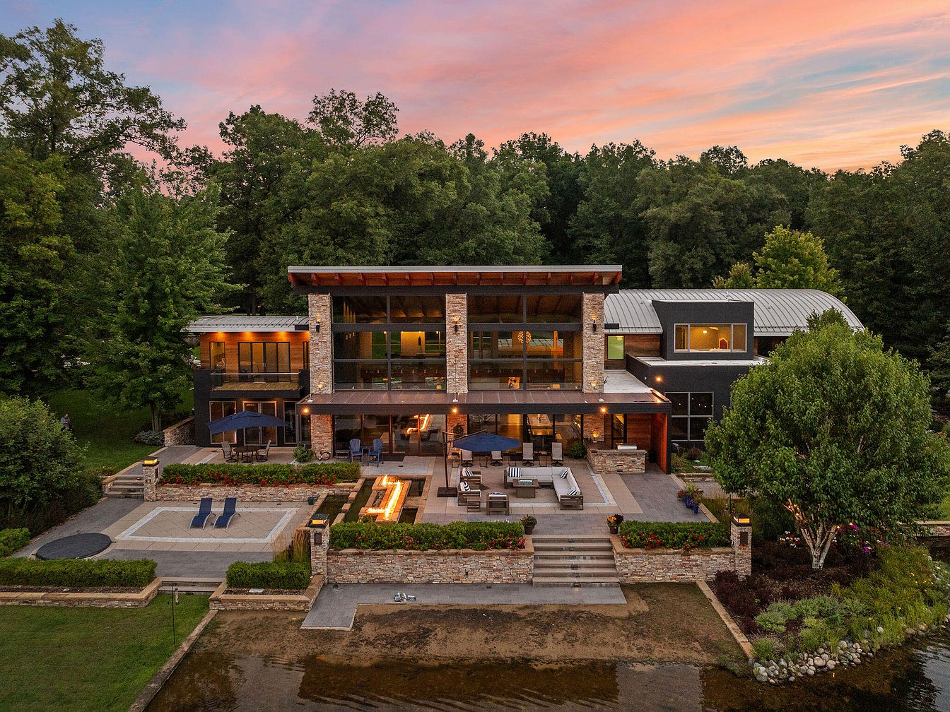 Spacious multi-level patio offers a seamless connection to the lake, perfect for family gatherings and outdoor entertainment. The design features sleek contemporary lines paired with natural stone columns and wood accents, creating a warm, inviting atmosphere. Furnished with modern loungers, sectional sofas, and shaded dining tables, this space is ideal for relaxing or barbecuing. Built-in planters and lush landscaping add vibrant green touches, while the fire pit creates a cozy area for evening storytelling. Soft lighting under the covered section enhances usability at dusk, ensuring year-round comfort and enjoyment for families and guests alike.