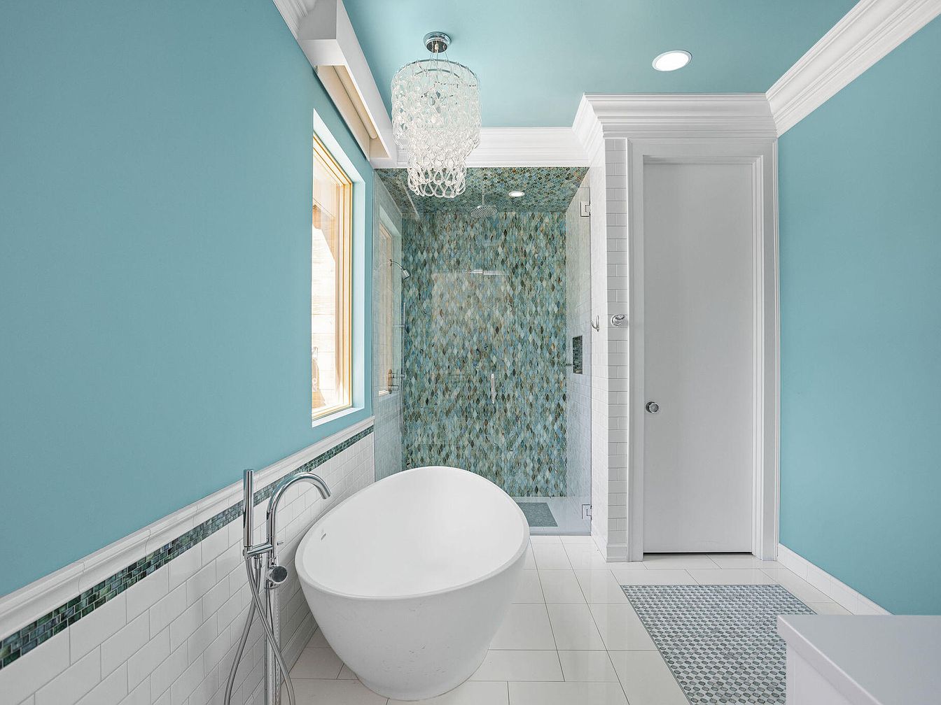 A serene bathroom retreat featuring cool aqua walls and ceilings, complemented by crisp white trim and crown molding. The space boasts a large oval freestanding soaking tub with a modern chrome fixture, positioned beside a sunny window that floods the room with natural light. The walk-in shower is adorned with shimmering mosaic tiles in soothing blue and green tones, creating a luxurious focal point. White subway tiles and a mosaic accent border add texture and visual interest. The room’s open layout and slip-resistant floor mat make it safe and accessible for families seeking comfort and relaxation in a spa-like atmosphere.