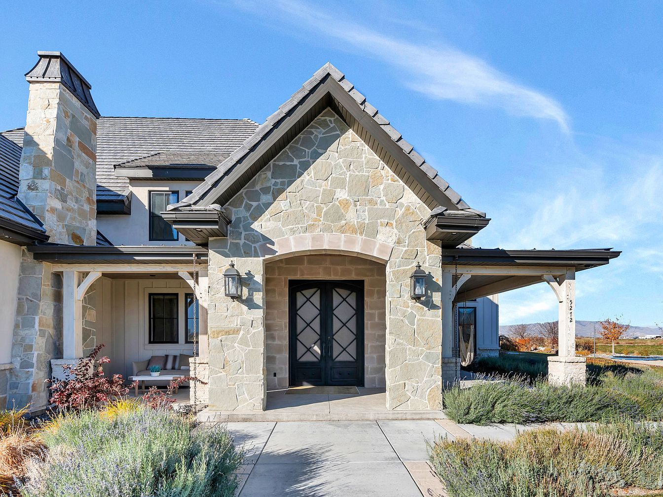 The inviting entryway features a stunning blend of natural stone and a sleek modern silhouette, setting a welcoming tone for the home. Elegant architectural details, including a steeply pitched roof and wrought-iron accents, enhance its aesthetic charm. Flanking the entrance, lush lavender and low-maintenance landscaping create a serene environment, perfect for family enjoyment. Subtle earthy tones dominate the color scheme, harmonizing beautifully with the soft light streaming through the large windows. A cozy seating area on the porch invites relaxation, turning this space into a functional outdoor retreat, ideal for gatherings with friends and family.