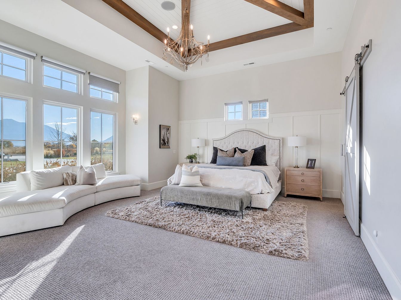 This serene master bedroom features a spacious layout accentuated by large windows that frame stunning mountain views. The neutral color palette of soft greys and whites creates a calm atmosphere, complemented by plush carpeting. A luxurious upholstered bed is the room’s focal point, adorned with an array of textured pillows. A cozy reading nook with a curved sectional invites relaxation, while a chic chandelier adds a touch of elegance. The design incorporates functional elements with bedside lamps and a stylish nightstand, making it perfect for family living. Subtle architectural details like wainscoting contribute to the overall sophistication.