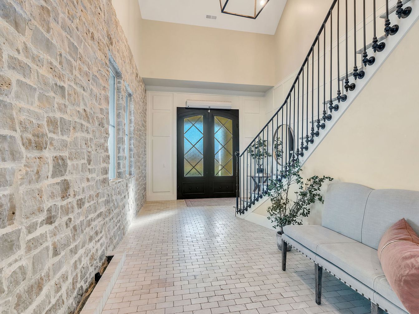 The inviting entryway features a stunning stone wall that adds a rustic charm. Natural light floods the space through the tall windows, enhancing the warm beige hues of the walls. A striking double door with diamond-patterned glass serves as a focal point, inviting guests inside. Elegant black railings lead to an upper level, offering a refined contrast with the light-colored flooring, which is crafted from small, polished tiles. An understated gray bench provides a cozy spot for visitors, while a strategically placed plant introduces a touch of greenery, creating a friendly and welcoming atmosphere for family and friends.