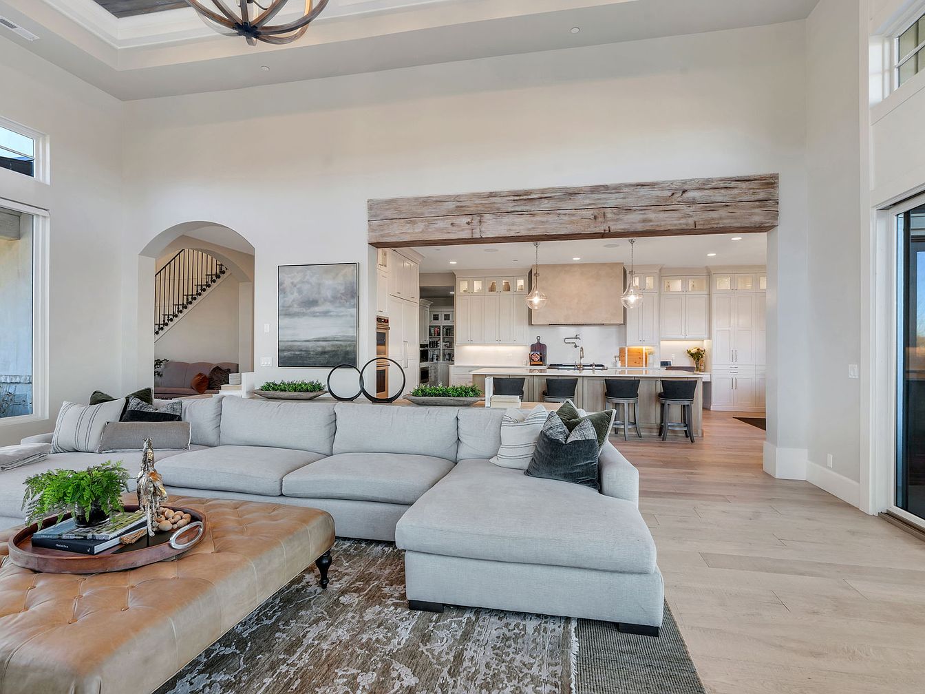 This elegant living room seamlessly blends comfort with modern design. The spacious layout features a large sectional sofa adorned with an array of textured pillows, creating an inviting atmosphere for family gatherings. Warm hardwood flooring complements the soft, neutral color palette, while the coffered ceiling adds architectural interest. A rustic beam overhead connects the living space to a stylish kitchen, visible through an open archway. Decorative elements, such as a plush area rug and a chic coffee table, enhance the cozy ambiance. Sunlight floods in through expansive windows, highlighting the room’s airy and bright feel.