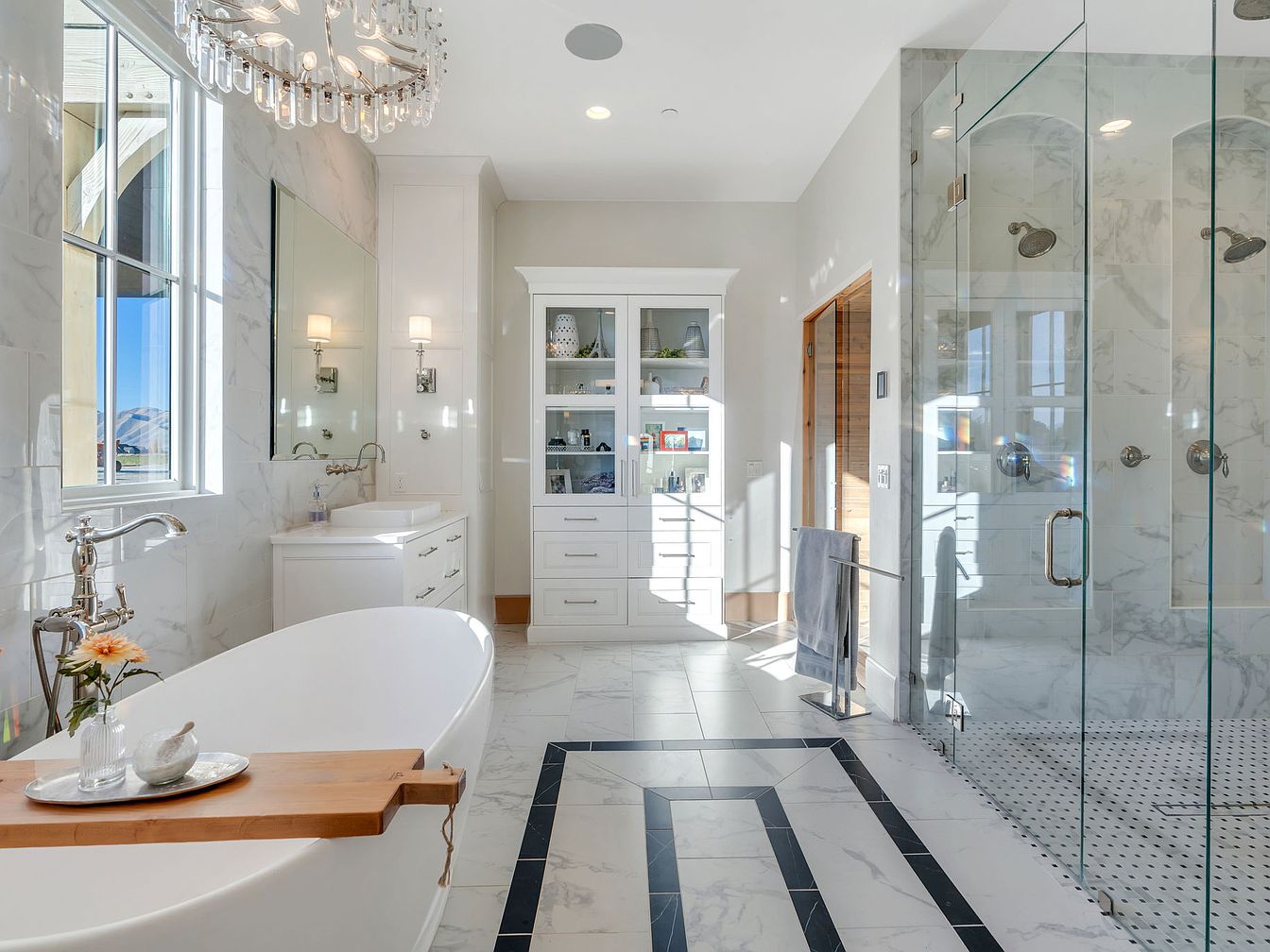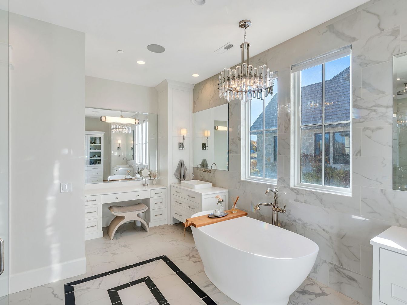 This elegant bathroom features a spacious layout infused with modern luxury. A freestanding soaking tub serves as the centerpiece, complemented by a stunning marble surround that exudes sophistication. The dual vanity, adorned with sleek white cabinetry, offers ample storage while maintaining a minimalist aesthetic. Natural light floods the space through large windows, enhancing the serene ambiance. Statement lighting, including a sparkling chandelier, adds a touch of glamour. The chic black and white tile pattern on the floor creates a striking visual contrast, providing both style and functionality, making this bathroom a perfect retreat for relaxation and rejuvenation.