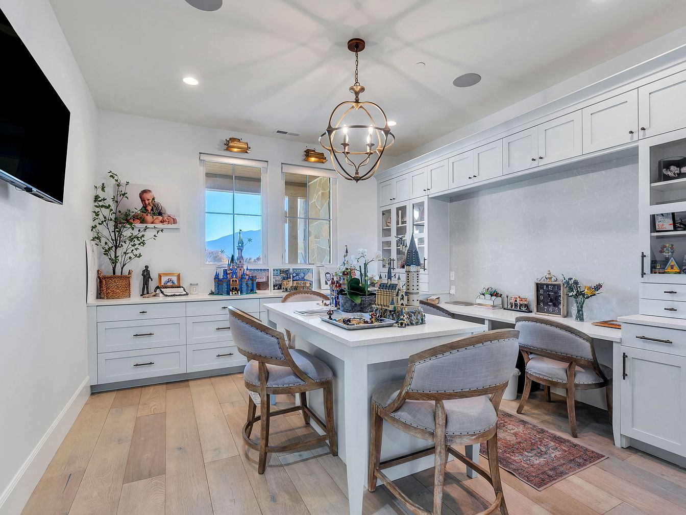 This inviting family workspace combines modern functionality with comfort. A large, white countertop island provides ample space for creative projects and family gatherings. The open layout is enhanced by natural light streaming in through expansive windows, offering a picturesque view. Soft gray and white tones are complemented by rustic wooden accents in the furniture, such as charming armchairs and cabinetry. Decorative shelves showcase personal touches and cherished memories, creating a homely atmosphere. The space incorporates practical elements, such as ample storage and a wall-mounted TV, catering to both productivity and leisure for every family member.