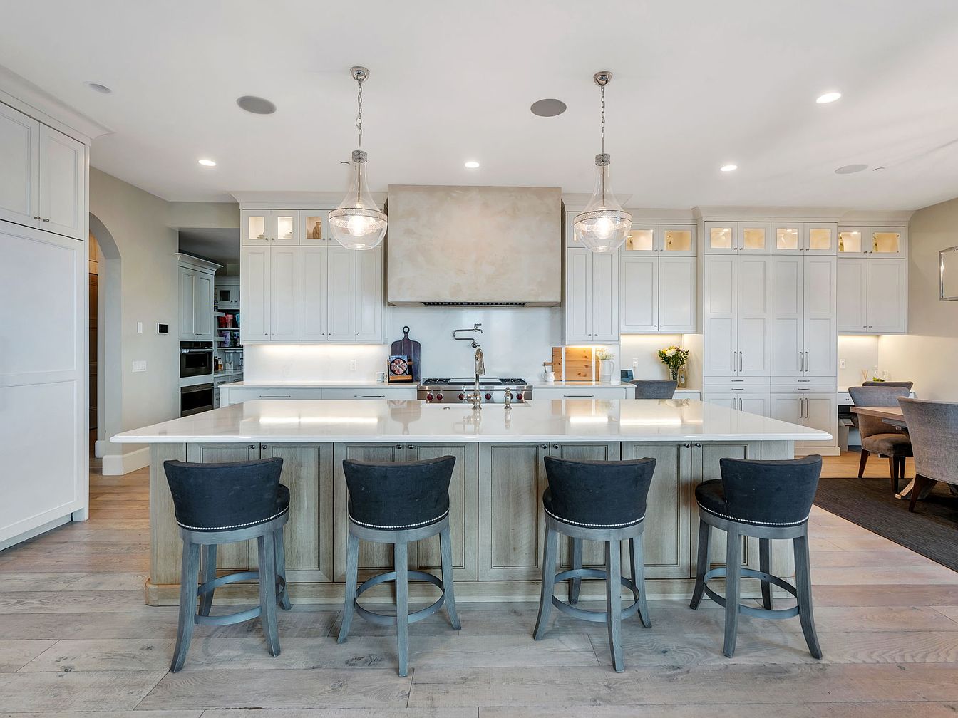 This contemporary kitchen features an inviting layout with a central island that enhances family interaction. The soft color palette of light gray cabinetry complements the bright white quartz countertops, creating a clean and airy atmosphere. A spacious design includes ample upper cabinets with frosted glass accents for subtle elegance. Stylish pendant lighting hangs above the island, adding a touch of sophistication. Versatile bar stools enhance functionality, while the warm wood tones of the flooring and cabinetry introduce a cozy feel. The strategic placement of appliances ensures efficiency, making this space perfect for family gatherings and culinary adventures.